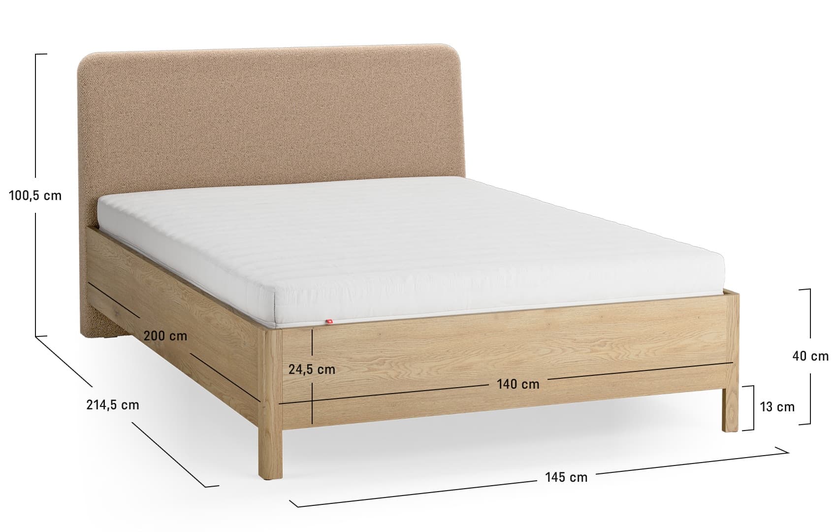- Der Korpus des Bettes steht auf Eichenholzfüßen, die den Korpus über den Boden heben, ihm Leichtigkeit verleihen und die Ordnung im Schlafzimmer erleichtern.