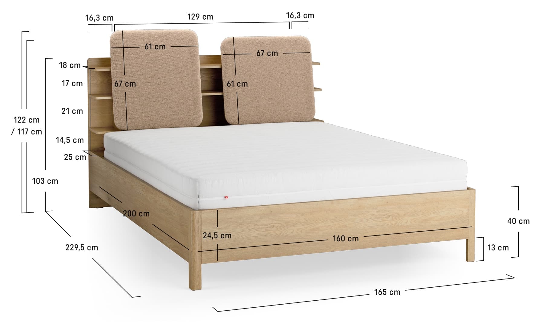 - Der Korpus des Bettes ist in Eichenfarbe.