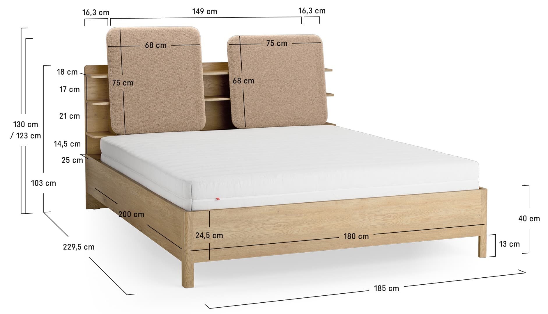 - Der Korpus des Bettes steht auf Eichenholzfüßen, die den Korpus über den Boden heben, ihm Leichtigkeit verleihen und die Ordnung im Schlafzimmer erleichtern.