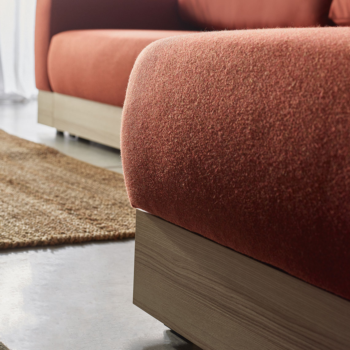- Im unteren Teil des Möbels befindet sich eine Zierleiste mit einer Holzoberfläche. Dieses elegante Detail hebt das Möbel von anderen Tela-Elementen ab. Es stehen 3 Farben zur Verfügung, die mit den Creative-Möbeln (Vincenza Eiche, Corbridge Eiche) und Spot (Akazie) ein stimmiges Ganzes bilden. Sie können sich auch für eine Eckvariante mit einem gepolsterten Rand entscheiden, der mit dem gleichen Stoff wie das restliche Möbelstück bezogen ist.