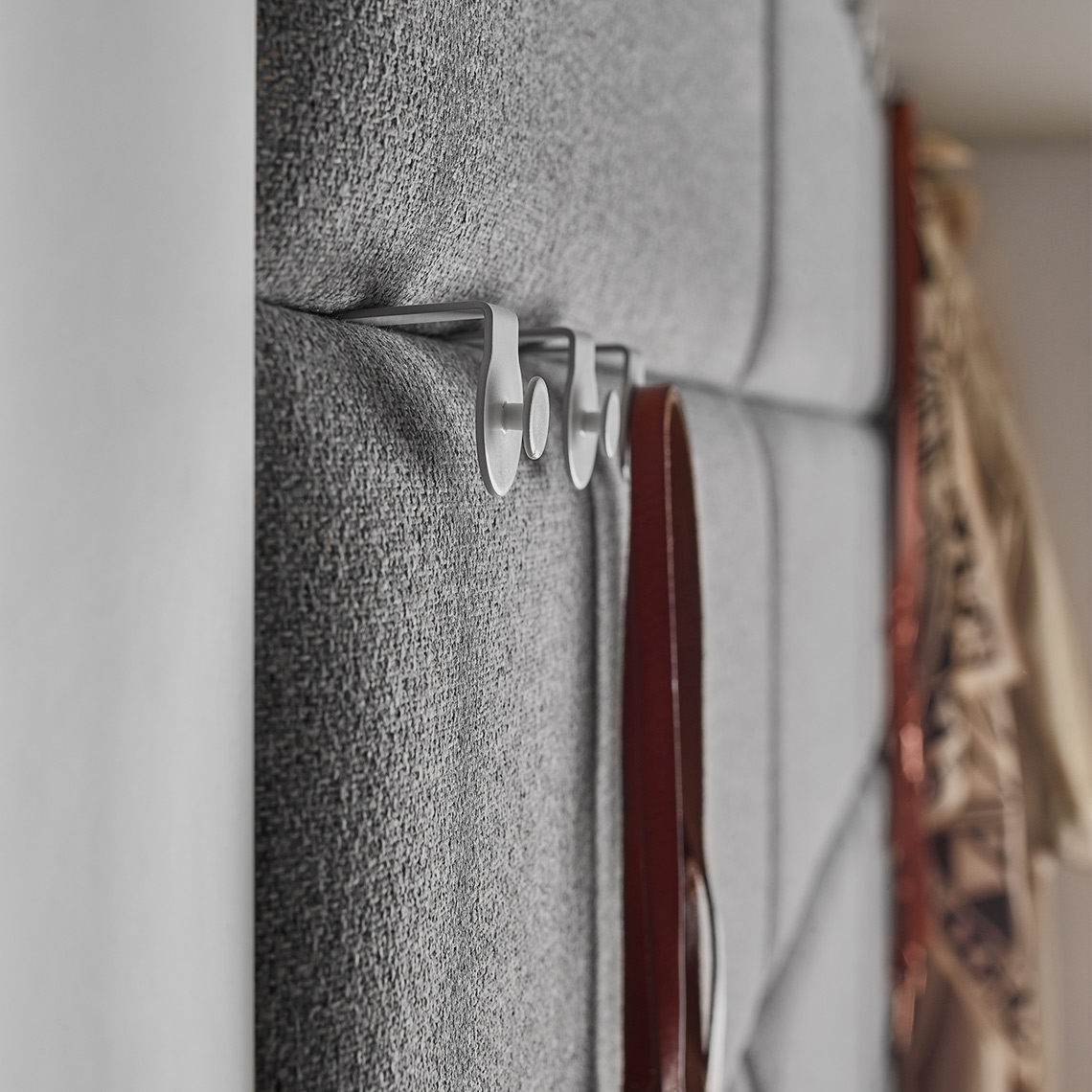 Metallhaken für Soform-Polsterelemente. Erhältlich in 2 Farben, kann er als Aufhänger für Oberbekleidung und verschiedene Accessoires dienen. Der Haken wird zwischen den Paneelen montiert, bevor diese verleimt werden.