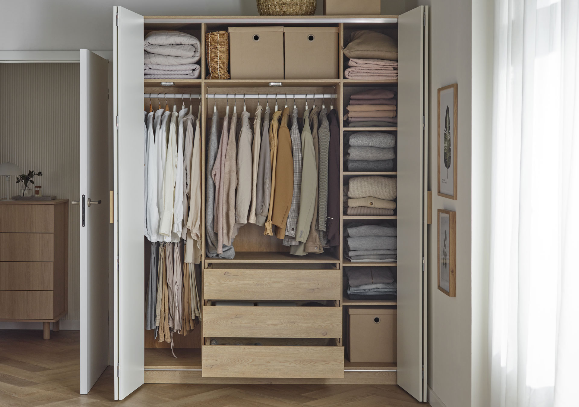 Der geräumige Kleiderschrank Stor ersetzt einen separaten Kleiderschrank und erleichtert die Organisation von Kleidung und Accessoires. Er fügt sich perfekt in die Einrichtung eines Schlafzimmers oder Flurs ein und passt sich den wechselnden Bedürfnissen der Haushaltsmitglieder an. Die praktische Schiebe-Falttür ermöglicht den freien Zugang zum gesamten Innenraum. Dank der eingebauten LED-Beleuchtung auch nach Einbruch der Dunkelheit. Sie können seine Ausstattung Ihren Bedürfnissen anpassen und ihn mit einem seitlichen Kleiderschrank erweitern, um noch mehr Stauraum zu gewinnen. Mit den zusätzlichen Blenden wird er zu einem Einbauschrank wie nach Maß, der von der Stange erhältlich ist.