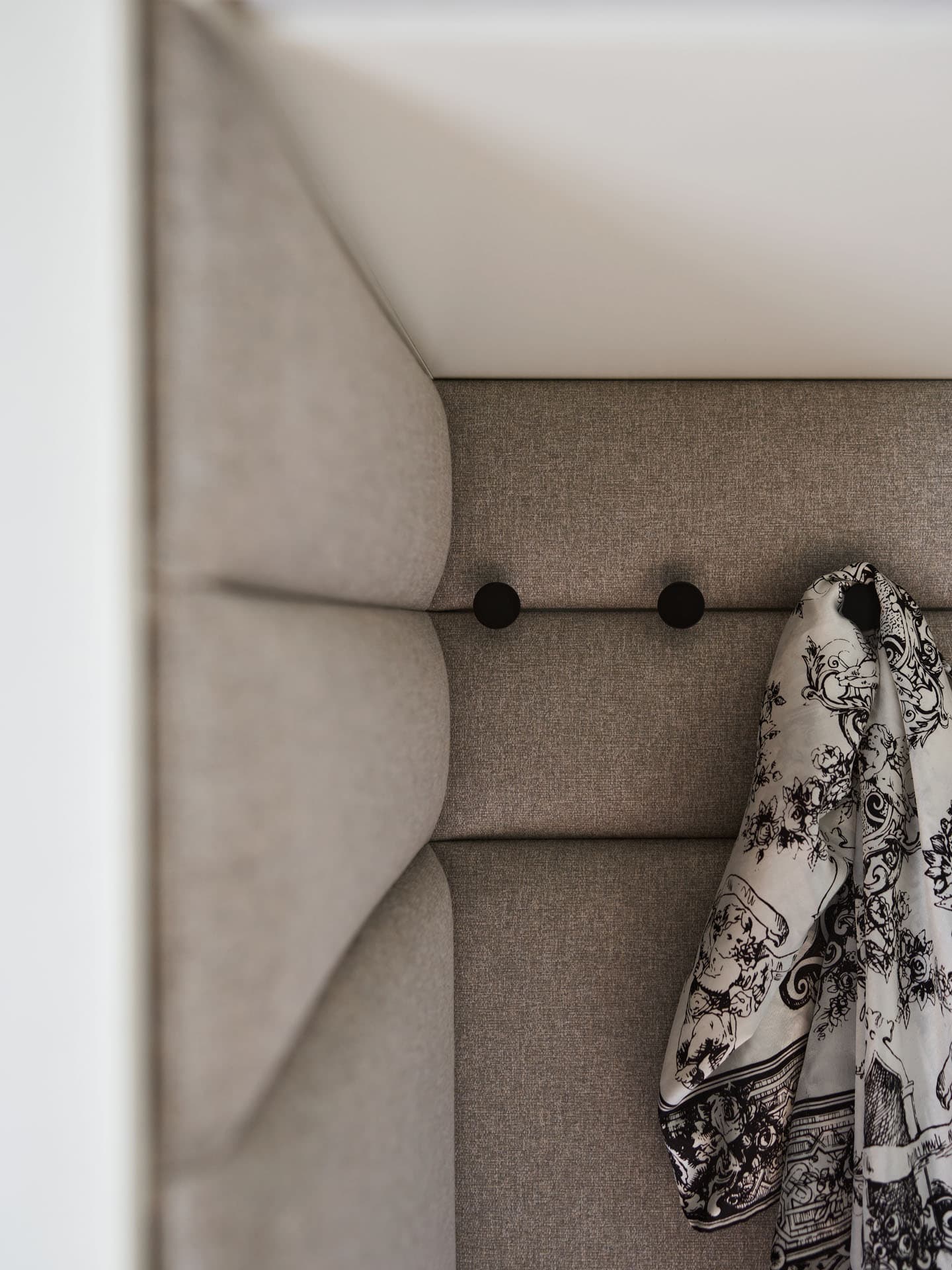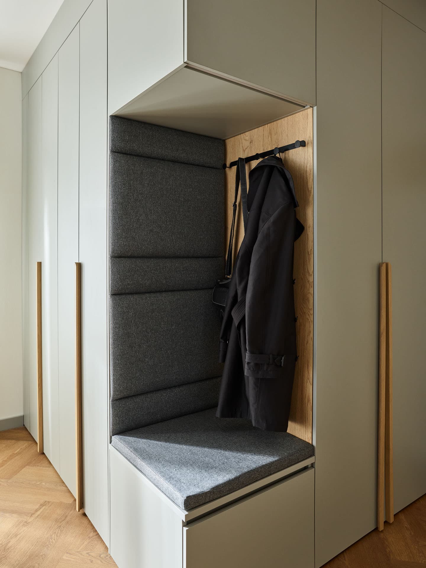 Gepolsterte Paneele bringen ein angenehmes Gefühl von Wärme in den Innenraum. Sie schützen die Wand vor Schmutz und Abrieb und ermöglichen gleichzeitig ein bequemes Zurücklehnen beim An- und Ausziehen der Schuhe, was die täglichen Vorbereitungen zum Ausgehen erleichtert.