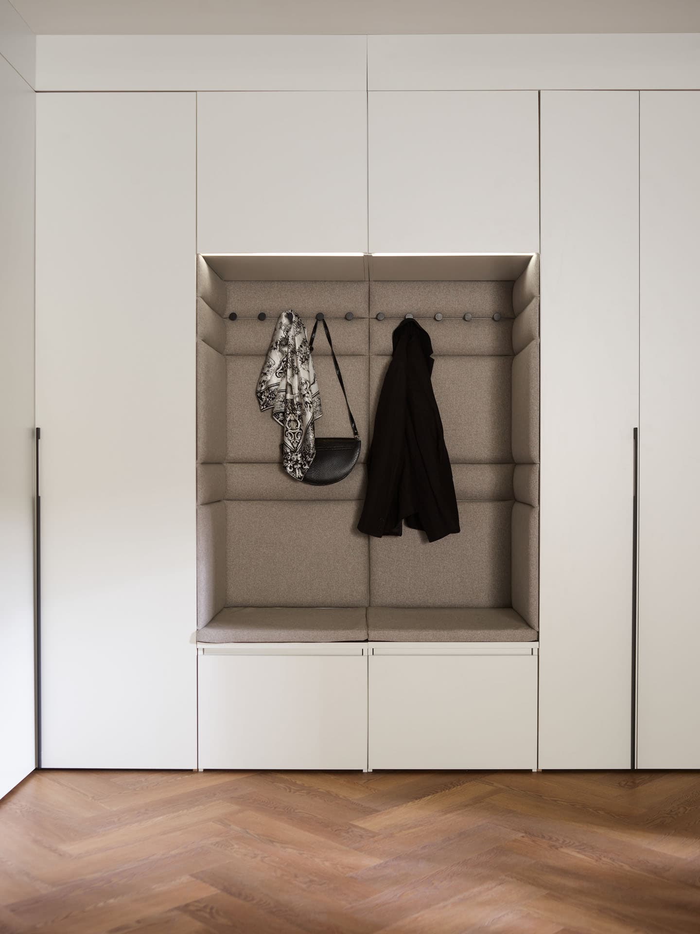 Gepolsterte Paneele bringen ein angenehmes Gefühl von Wärme in den Innenraum. Sie schützen die Wand vor Schmutz und Abrieb und ermöglichen gleichzeitig ein bequemes Zurücklehnen beim An- und Ausziehen der Schuhe, was die täglichen Vorbereitungen zum Ausgehen erleichtert.