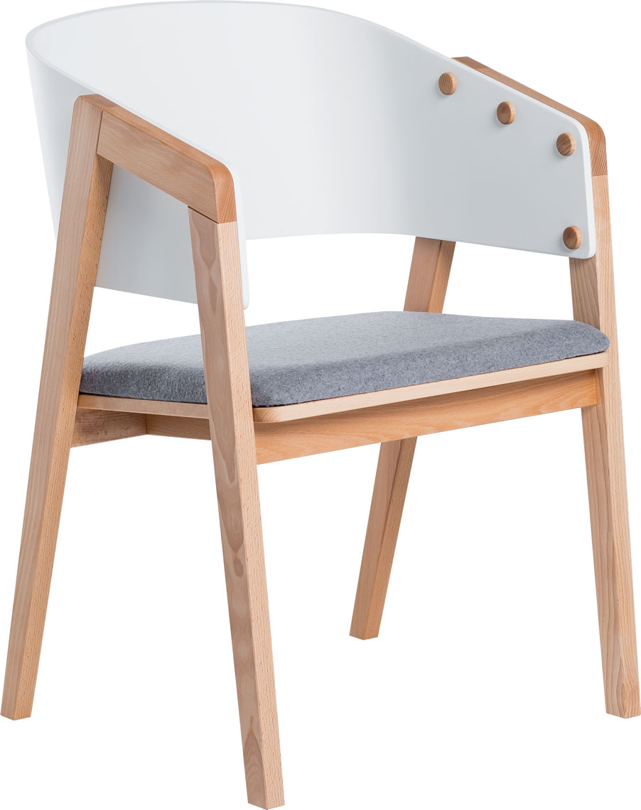 Für das Gestell des Stuhls wurde robustes Buchenholz verwendet. Die geschwungene Rückenlehne wurde aus Sperrholz gefertigt und die Sitzfläche ist mit einem Stoff aus 40% Wolle, 32% Viskose und 28% Polyester bezogen.