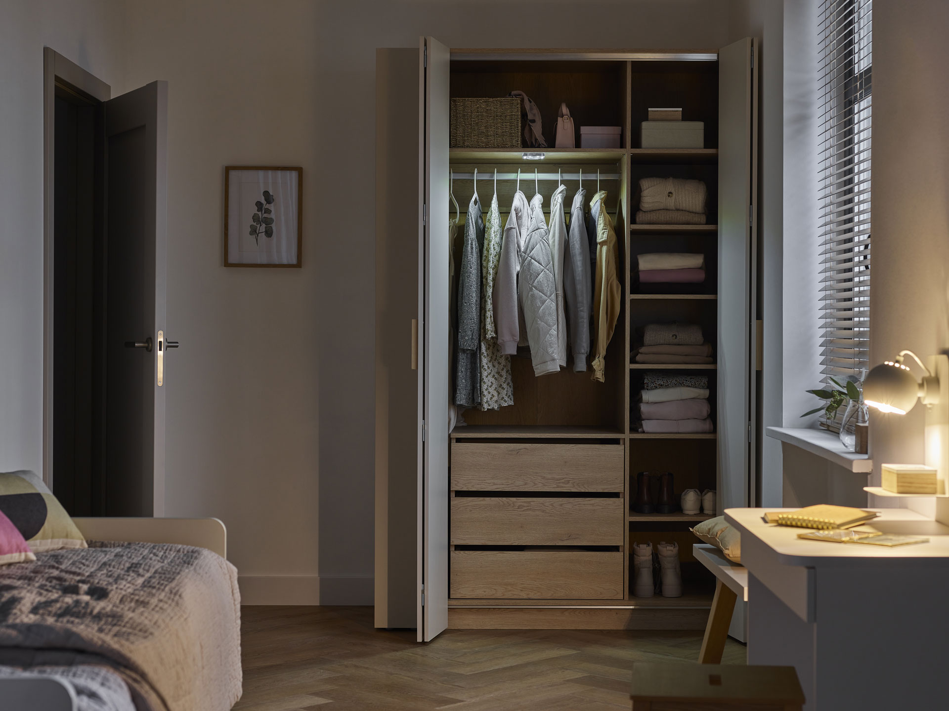 - À l'intérieur de l'armoire se trouvent des lumières LED avec capteurs de mouvement, qui s'allument lorsque le meuble est ouvert. Cela permet de sortir les vêtements sans avoir à allumer la lampe principale.