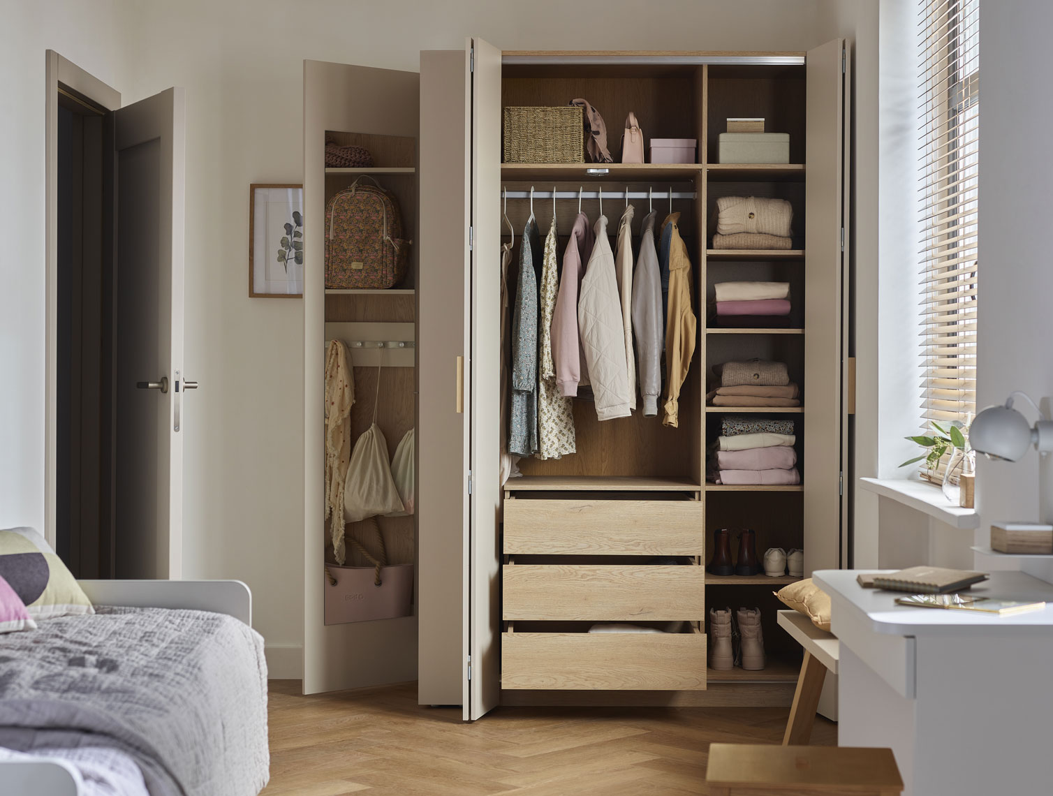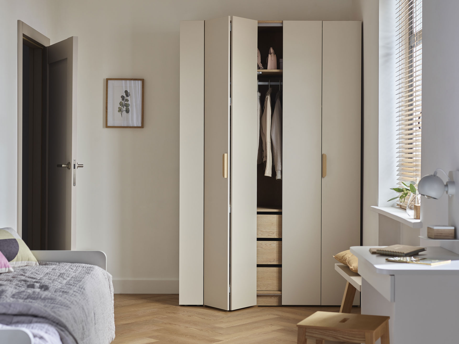 - Ses portes coulissantes, dotées d'un système de fermeture silencieux, se replient en accordéon et permettent d'accéder librement à l'ensemble du contenu de l'armoire. Elles occupent moins d'espace en profondeur, ce qui permet de positionner le meuble plus près du lit.