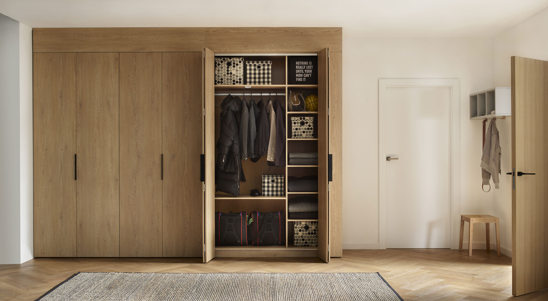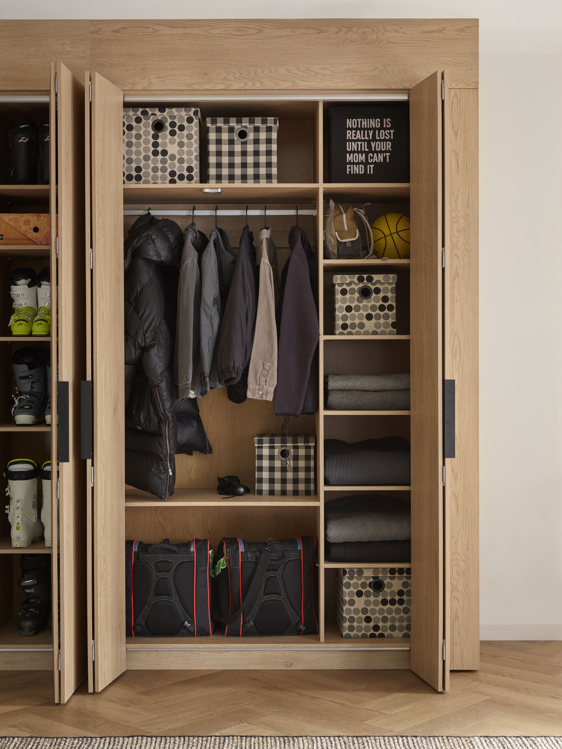 L'armoire Stor, avec ses portes pliantes pratiques et son intérieur éclairé, vous aidera à organiser votre garde-robe en fonction de vos besoins. Vous pouvez choisir votre propre version d'aménagement parmi les 3 formules disponibles. En ajoutant une armoire latérale, vous gagnerez encore plus d'espace pour vos affaires. Combinée à une armoire d'une largeur différente et à des panneaux de finition, elle crée une armoire spacieuse et sur mesure, disponible sur étagère. Idéale pour tous les intérieurs - du hall d'entrée à la chambre d'enfant en passant par la garde-robe et la chambre à coucher.