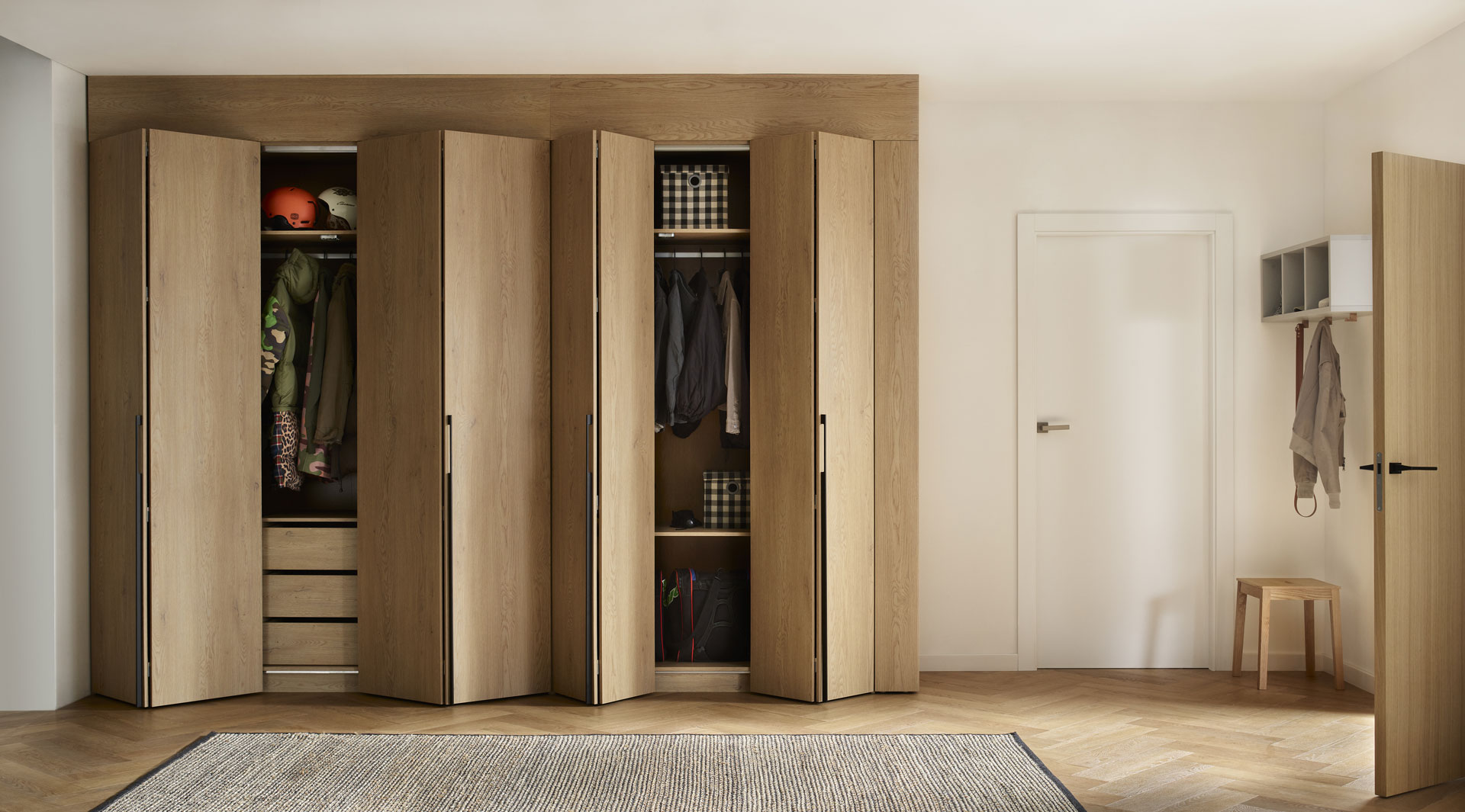 - Les portes coulissantes et pliantes permettent d'accéder librement à l'ensemble du contenu de l'armoire. Elles permettent également de gagner de la place dans la pièce. Grâce à des charnières élégamment dissimulées, elles s'ouvrent facilement et se ferment silencieusement.