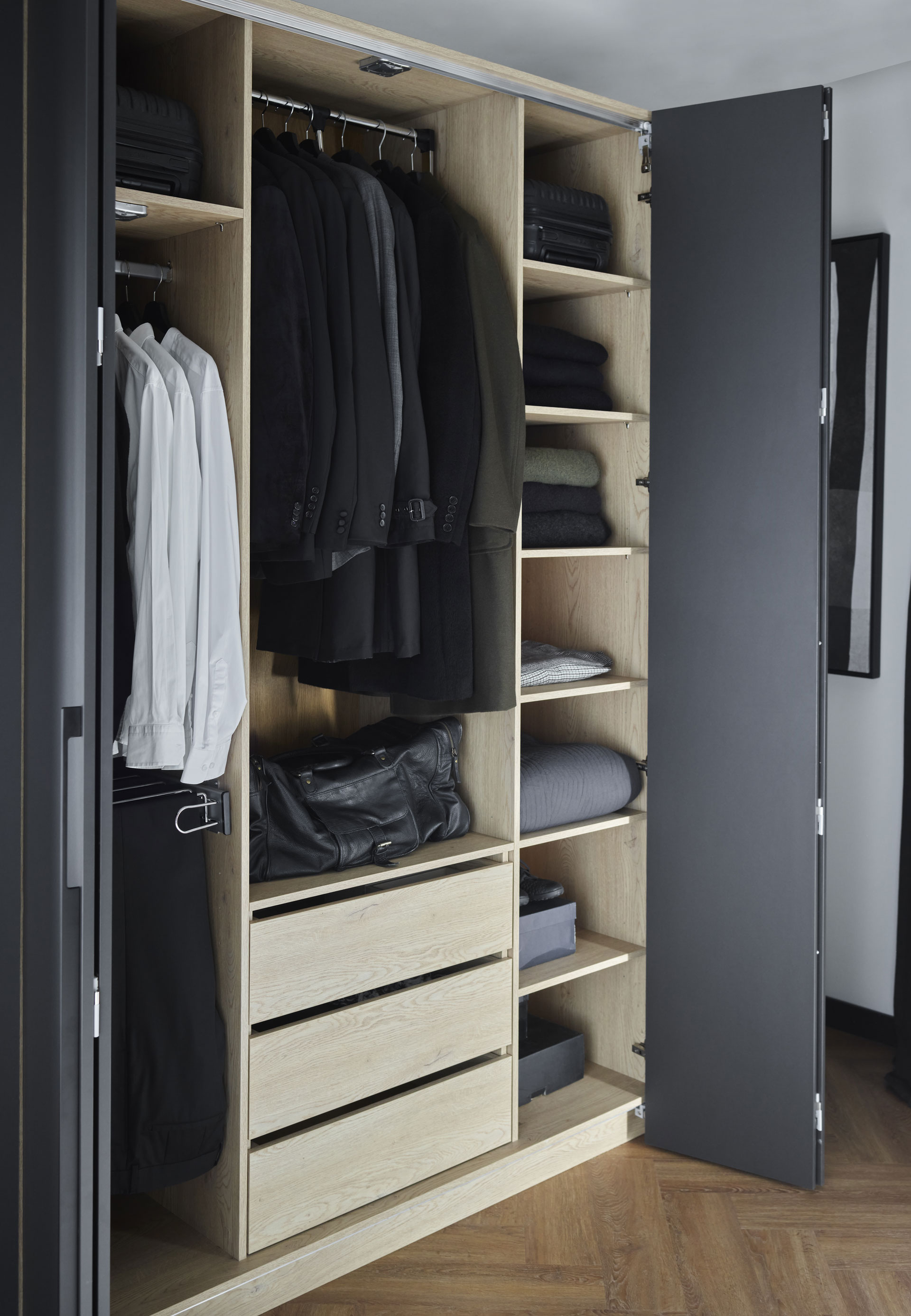 - En fonction de la hauteur de l'armoire, vous pouvez choisir entre 2 ou 3 ensembles d'ameublement prêts à l'emploi. Vous pouvez ainsi adapter l'intérieur de l'armoire à vos besoins et à la nature des objets que vous y rangez.
