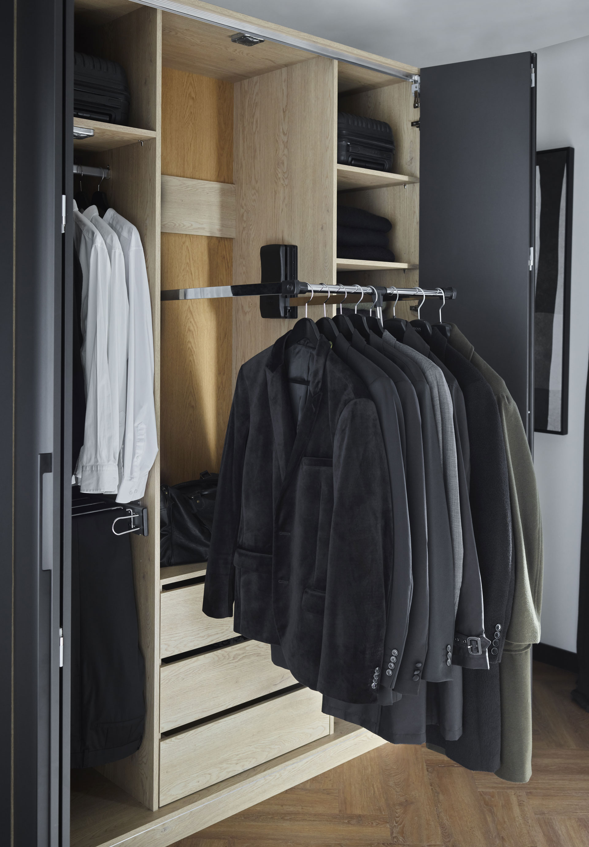 - L'armoire de 240 cm de haut de l'ensemble d'équipements Maxim dispose de 2 étagères fixes dans les segments latéraux. En outre, il y a une barre de suspension et un porte-pantalon extractible dans la partie gauche et 5 étagères réglables dans la partie droite, qui peuvent être ajustées à la quantité d'objets stockés. La partie centrale de l'armoire est équipée d'une barre de descente (pantographe), qui facilite l'accès aux objets suspendus en hauteur, et d'un caisson avec 3 tiroirs.