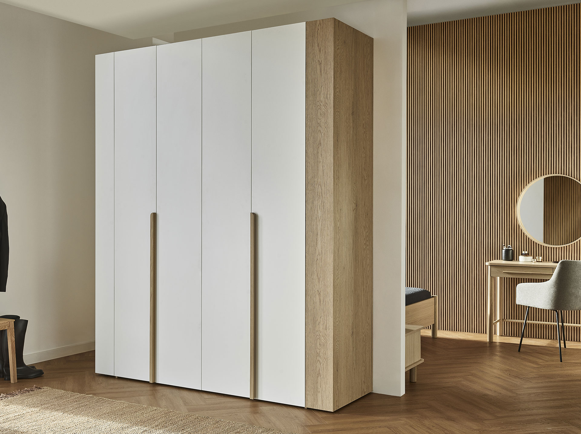 L'armoire Stor à 4 portes de 160 cm de large répond facilement aux besoins de deux personnes. Elle est dotée de portes coulissantes pratiques et d'un éclairage intégré. Elle peut être utilisée comme meuble indépendant et, grâce à ses panneaux de recouvrement, elle peut remplir n'importe quelle niche et remplacer une armoire sur mesure en tant qu'alternative plus rapide à la menuiserie encastrée. Des solutions astucieuses et des ensembles d'équipements prêts à l'emploi vous permettront de garder facilement les choses en ordre. Idéale pour tous les intérieurs - du hall d'entrée à la chambre des enfants, en passant par la garde-robe et la chambre à coucher.
