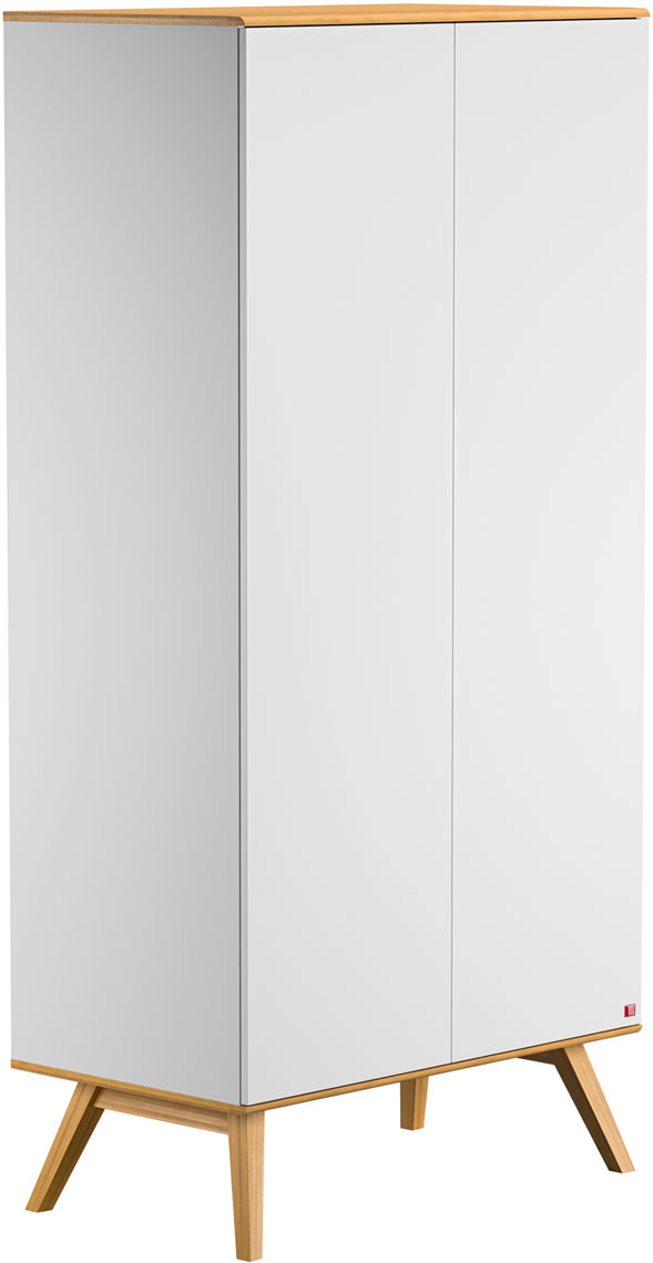 Armoire à 2 portes avec portes push-to-open/placard L'armoire est divisée en deux parties par une paroi centrale. Sur le côté gauche, il y a une étagère supérieure avec une barre de penderie et une étagère inférieure réglable suspendue en dessous. Sur le côté droit, il y a 4 étagères réglables. le bord supérieur du rebord est protégé par une plinthe en chêne. la hauteur de l'armoire est de 207,4 cm ; la hauteur des pieds de l'armoire est de 25 cm.