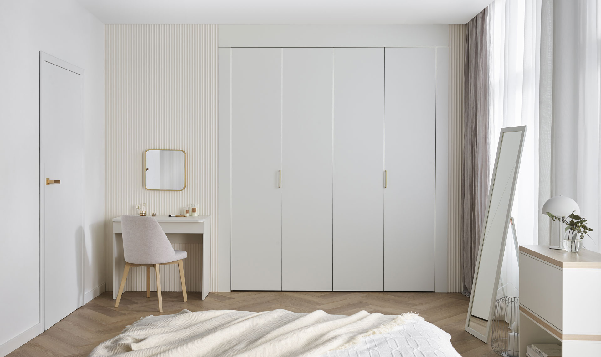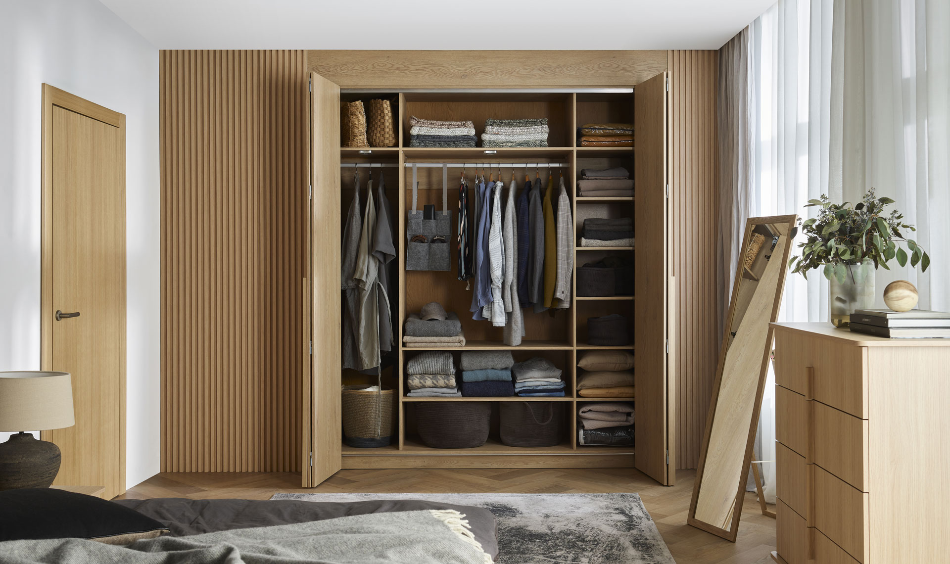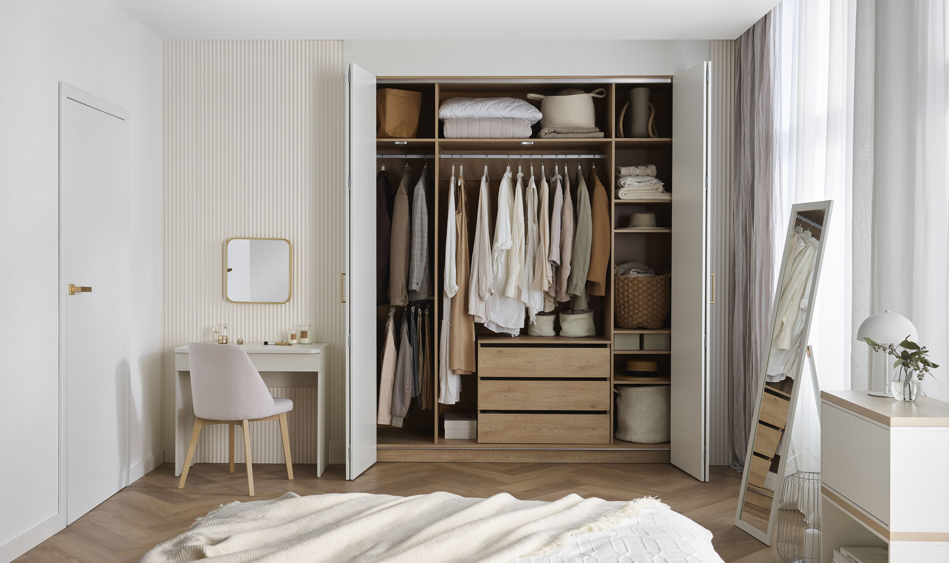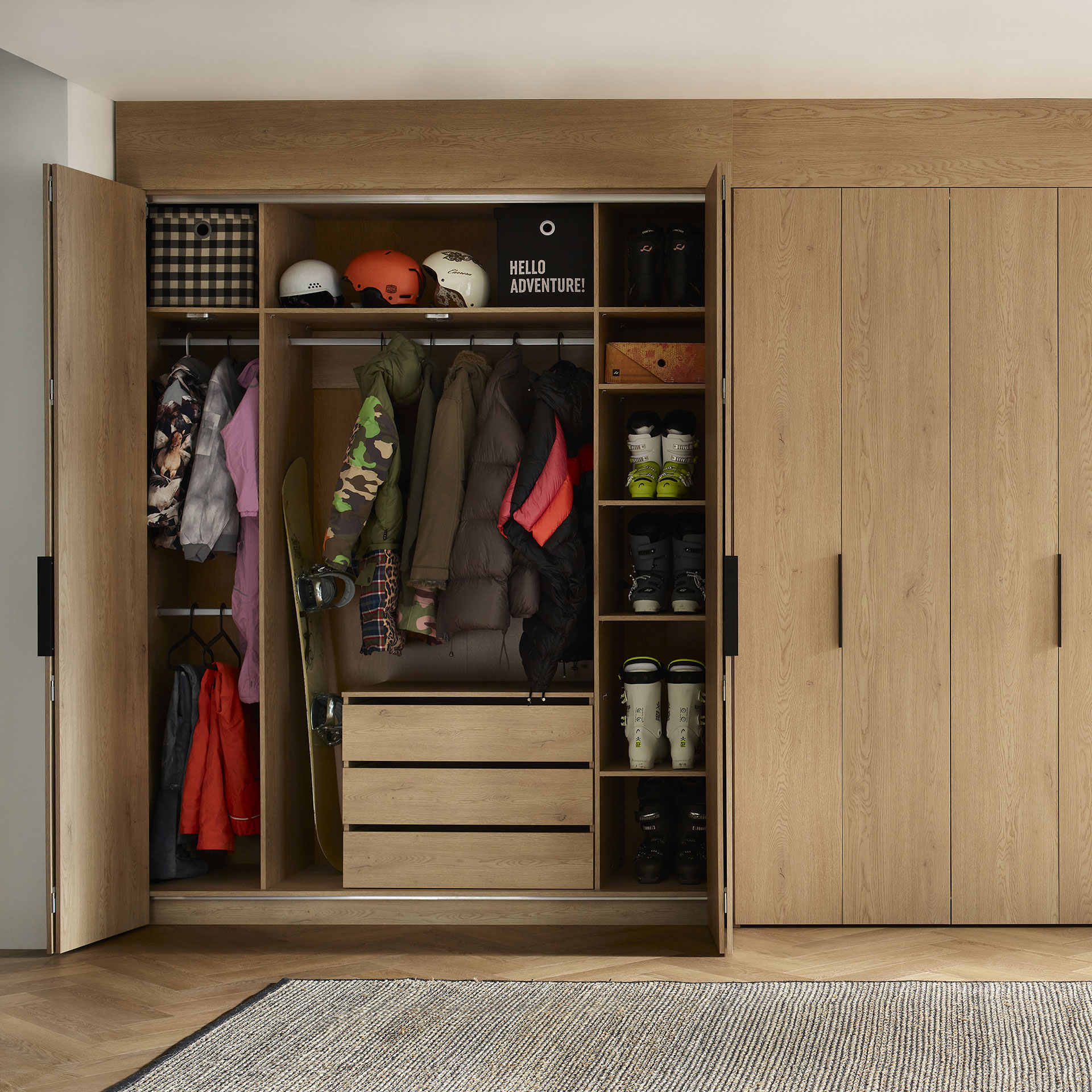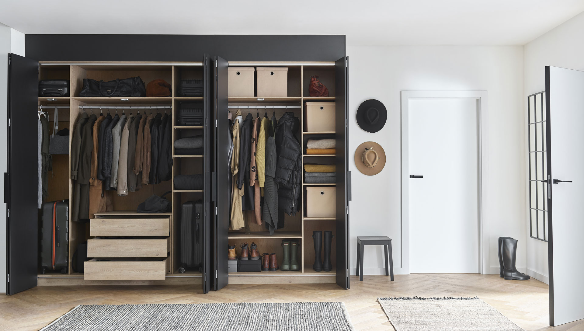 Le grand modèle d'armoire à 4 portes Stor peut servir d'armoire de taille normale pour deux adultes. Derrière les portes coulissantes et pliantes se cache un intérieur spacieux, que vous pouvez choisir parmi les packs disponibles ou compléter individuellement avec des articles supplémentaires. L'éclairage LED fourni avec l'armoire vous permettra de retrouver plus facilement vos affaires à la nuit tombée. Grâce à l'option de personnalisation, vous pouvez créer un meuble qui s'adapte parfaitement à vos goûts et à l'espace dont vous disposez. En ajoutant les panneaux de bordure, vous obtiendrez l'effet d'une armoire sur mesure sans avoir à attendre la commande d'un menuisier.