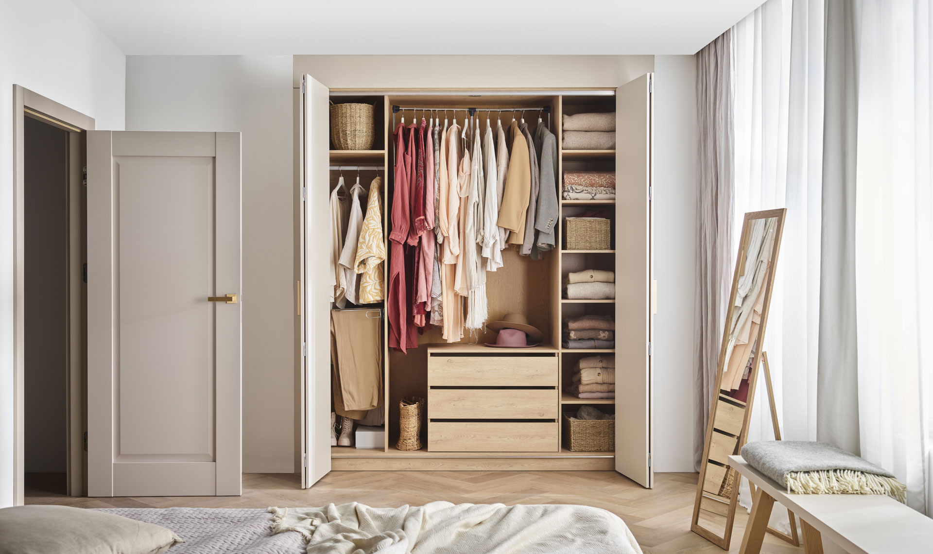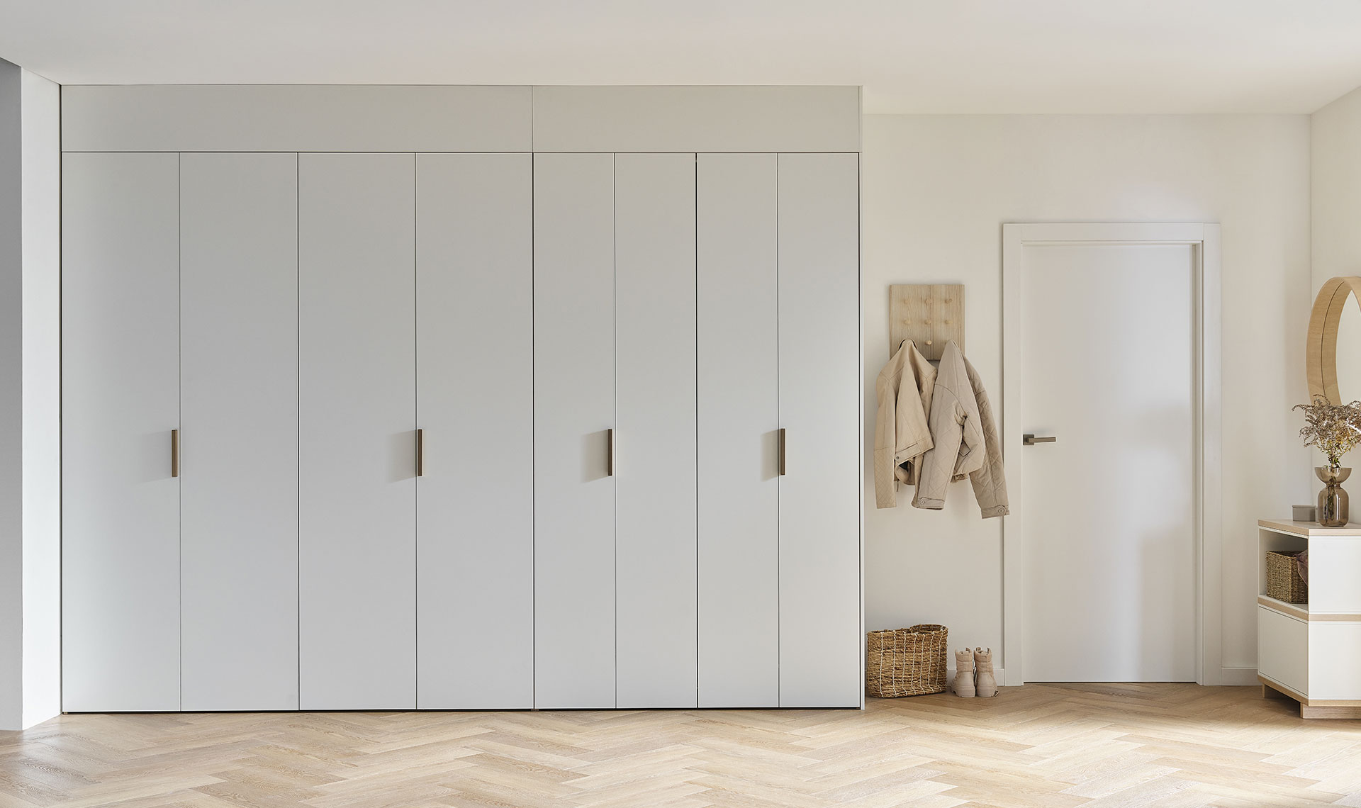 - Les portes coulissantes pliantes peuvent être légèrement agrandies d'un seul geste. Elles se plient en accordéon, ce qui leur confère un faible encombrement et un accès pratique à l'ensemble du contenu du meuble. Les charnières élégamment dissimulées sont équipées d'un système de fermeture silencieux.