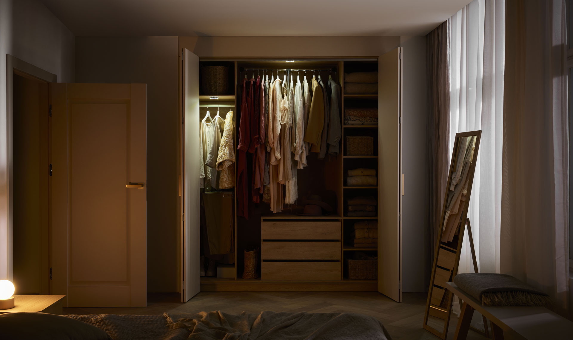 - À l'intérieur de l'armoire, des lampes LED à détection de mouvement s'allument à l'ouverture de la porte. Il est ainsi possible de sortir des vêtements sans éclairer toute la pièce.