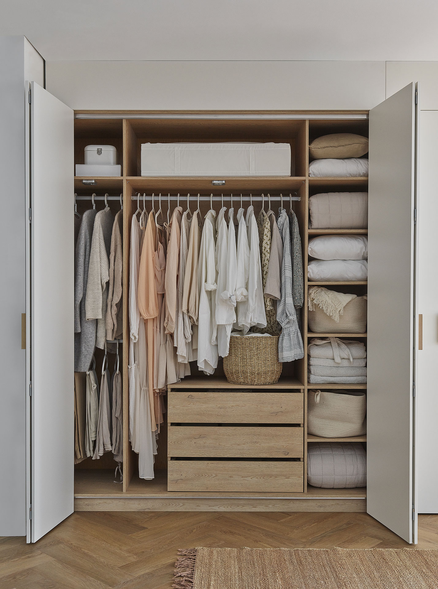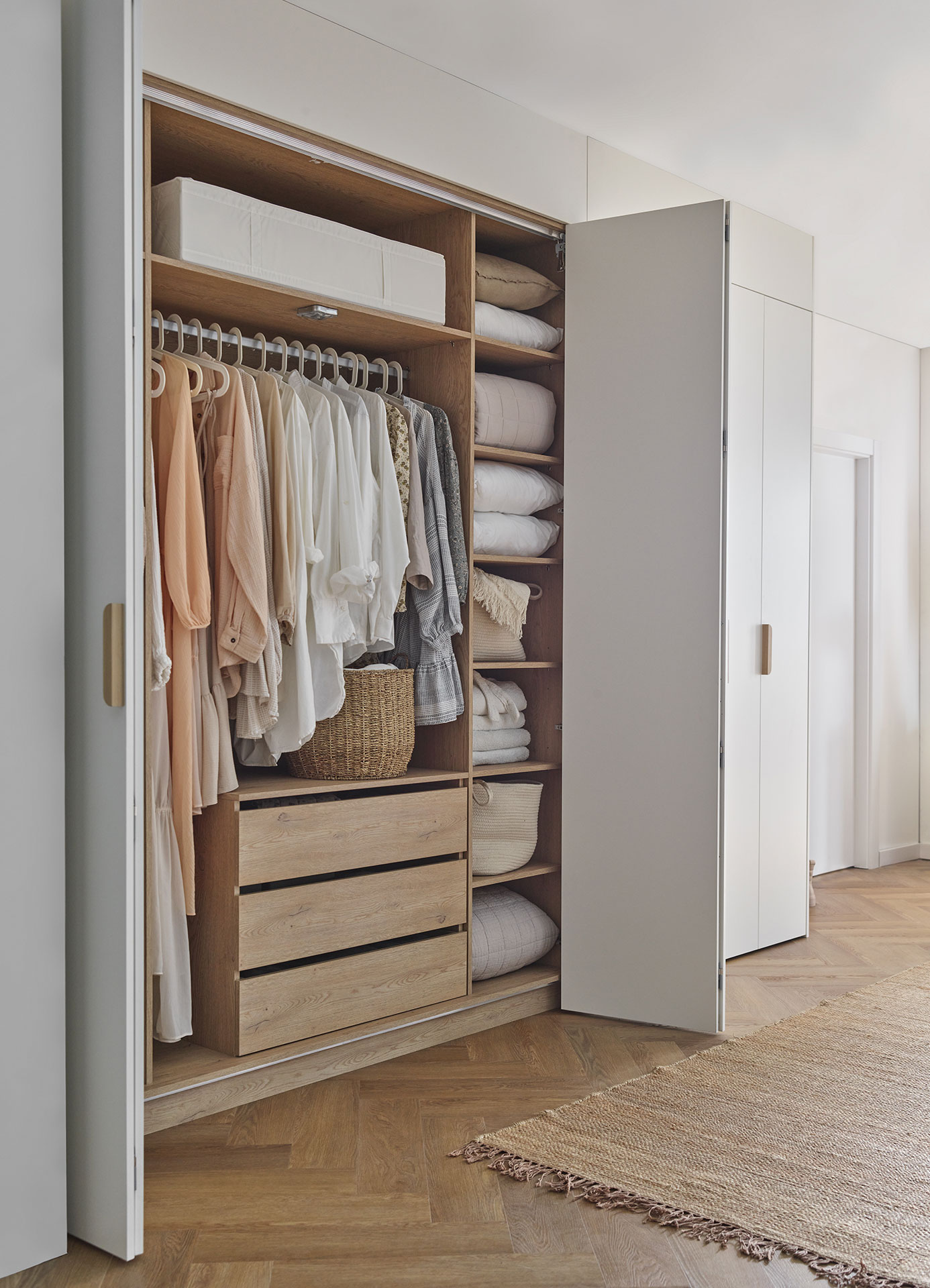 - L'ensemble Confort comprend 3 étagères fixes supérieures, 5 étagères réglables dans le segment de droite, 3 tringles à cintres. Au centre de l'armoire se trouve un caisson avec 3 tiroirs spacieux pour le linge et les accessoires - il peut être monté à gauche ou à droite de la niche. L'espace entre le caisson et la cloison peut être utilisé pour suspendre des vêtements très longs ou pour ranger des objets tels qu'une planche à repasser.