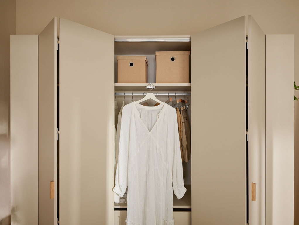 - Les portes coulissantes de l'armoire se replient en accordéon. Ainsi, tous les vêtements et accessoires sont toujours à portée de main. Les portes sont équipées d'un système de fermeture en douceur.