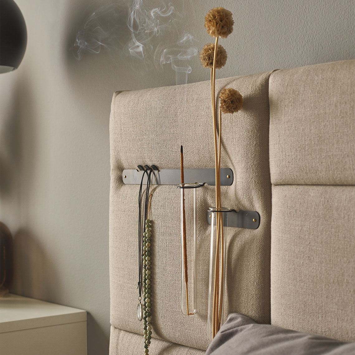 - Sur chacune des lattes se trouve une poignée permettant de fixer une fiole. Les tubes transparents sont parfaits comme petits vases pour les fleurs coupées et séchées - une façon simple d'ajouter une touche naturelle à votre environnement.