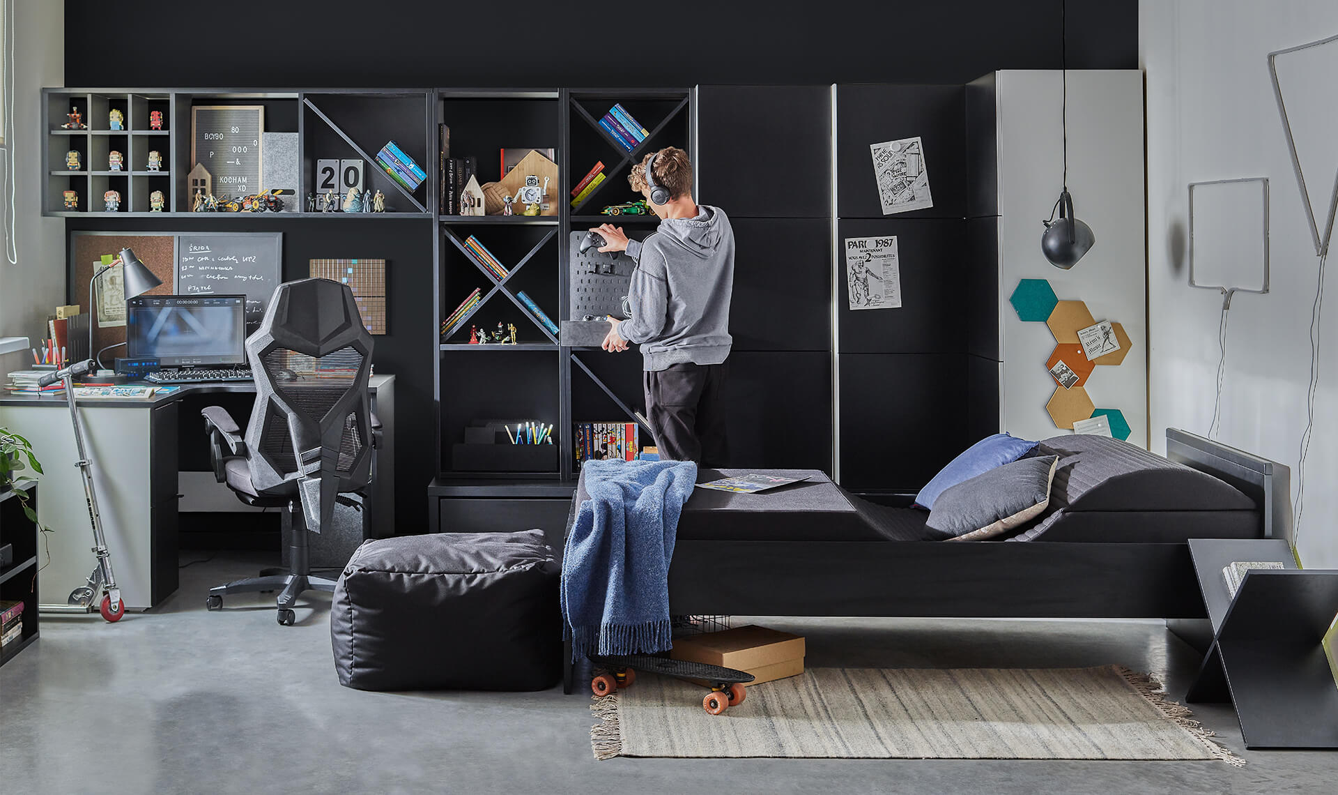 Le bureau d'angle de la collection Young Users vous permet d'utiliser chaque centimètre d'espace disponible dans la pièce. Le plateau spacieux est accompagné d'un caisson avec des tiroirs profonds, ce qui offre beaucoup d'espace de rangement pour les objets nécessaires à l'étude ou au travail.