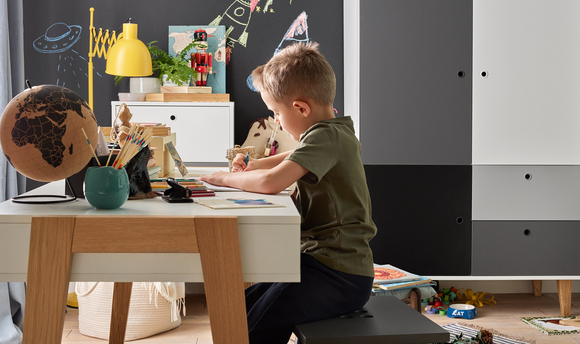 - Grâce à ses couleurs neutres et à sa grande surface de travail, le bureau est idéal pour les chambres d'enfants et d'adolescents, ainsi que pour un bureau à domicile ou un cabinet de travail. Pour adapter le mobilier à un intérieur spécifique, utilisez l'application intuitive VOXBOX.