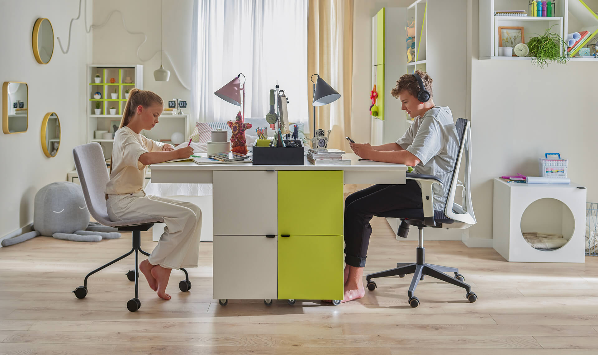 - Le fait que deux personnes puissent s'asseoir confortablement sur le bureau en fait une solution idéale pour les chambres de frères et sœurs.