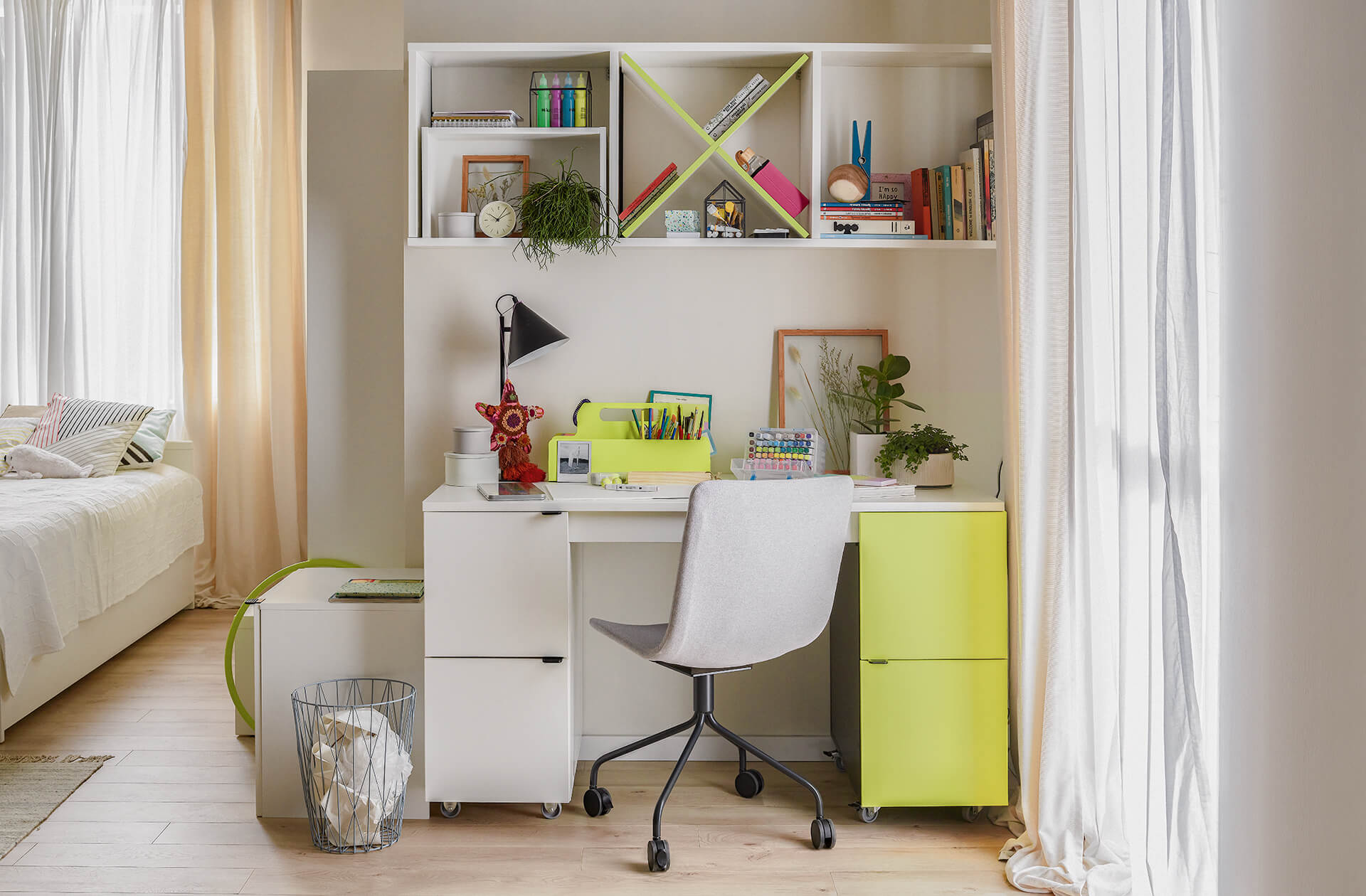 Le bureau innovant Young Users comprend des caissons mobiles dotés de tiroirs et d'une étagère. Leur espacement peut être modifié, ce qui permet de placer le meuble dans l'une des trois positions possibles, en fonction des besoins du moment. Grâce aux roulettes, le bureau peut être déplacé librement.