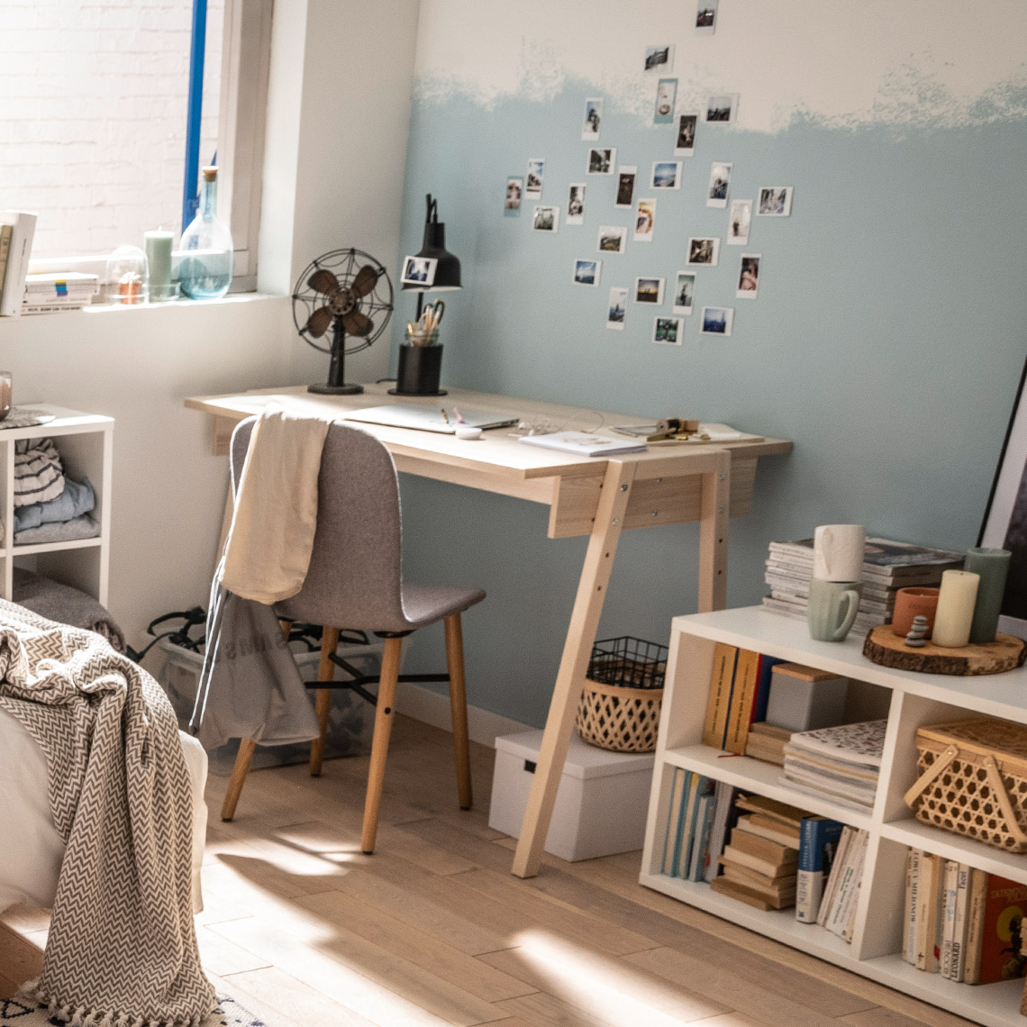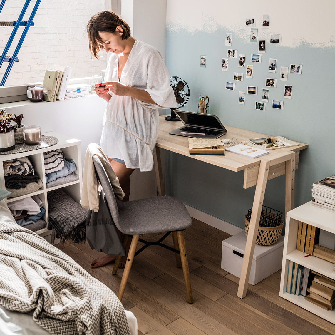 Bureau de la collection Spot Young avec un plateau réglable en hauteur et des pieds en bois massif. Grâce à sa palette de couleurs universelle, il conviendra aussi bien à la chambre d'un enfant qu'à celle d'un adolescent.