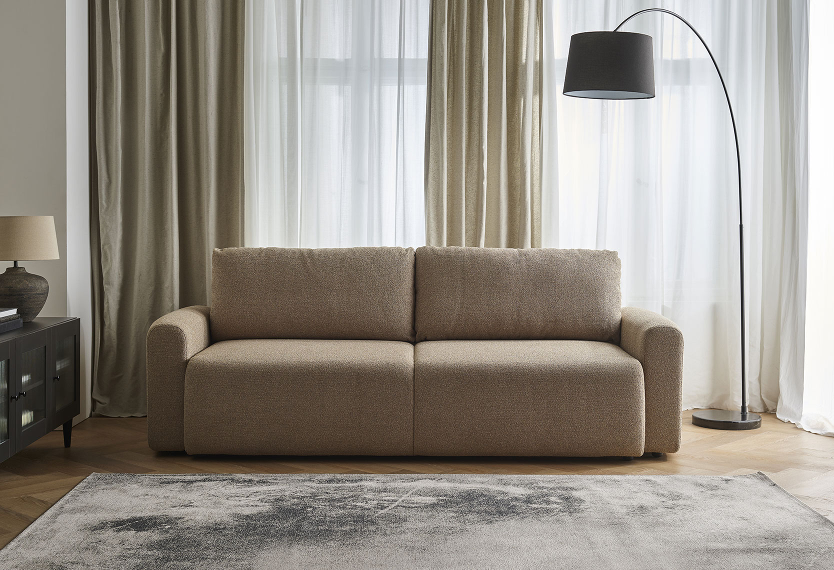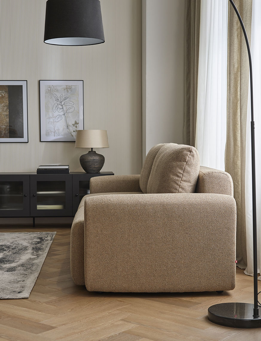 - Le canapé Fika a été conçu dans un souci de confort et de convivialité. Grâce à sa fonction de couchage, il se transforme facilement en un confortable lit double de 150 x 202 cm, idéal pour accueillir des invités pour la nuit.