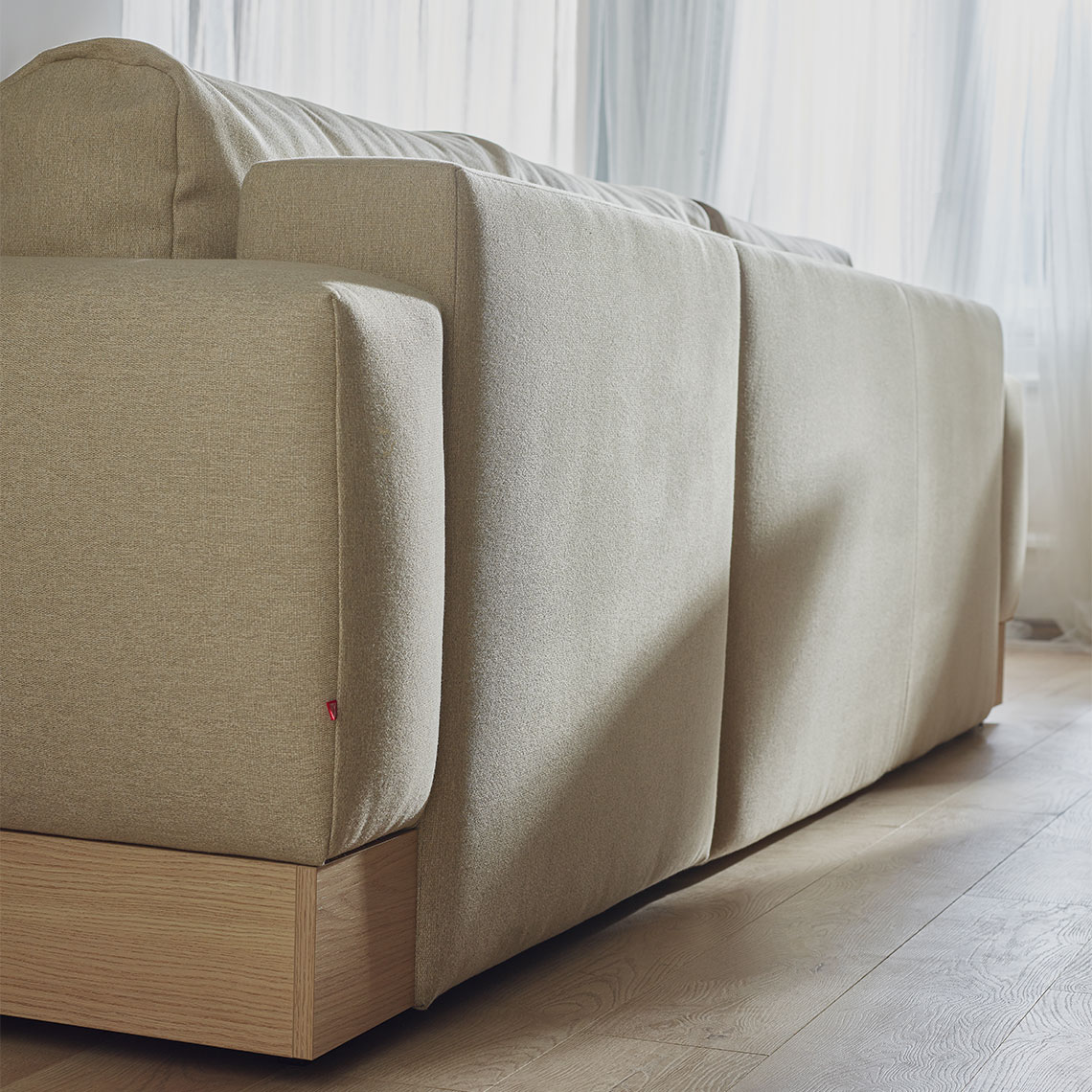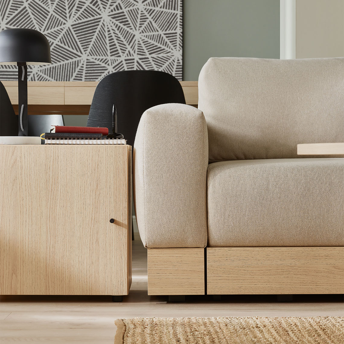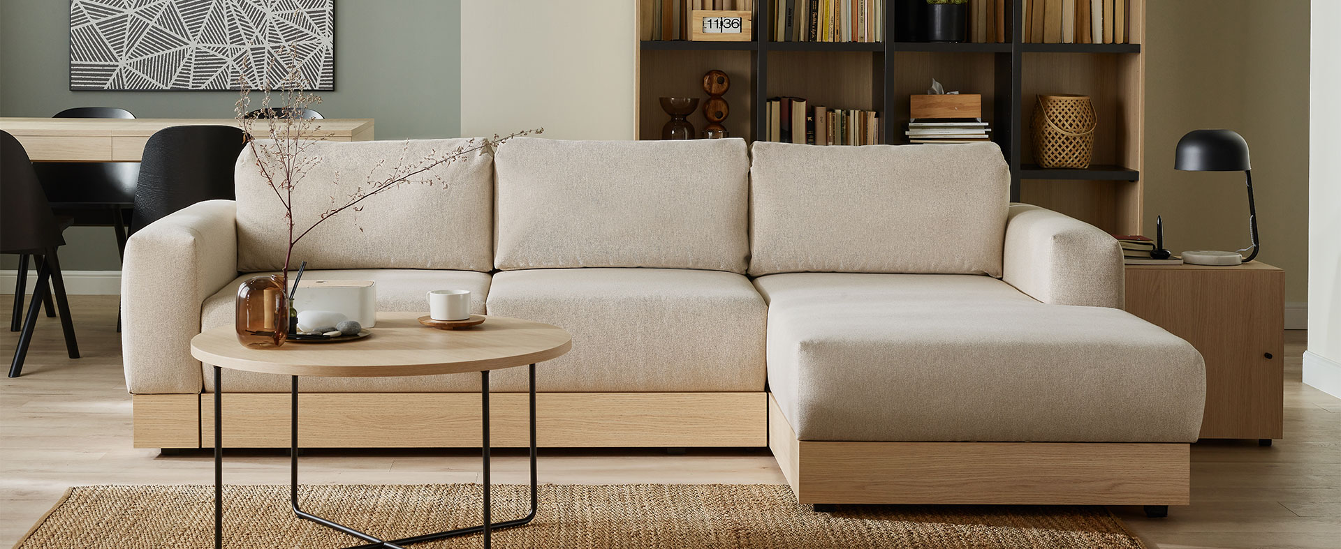 - Le canapé d'angle est orné d'un bandeau inférieur distinctif. Fini avec un décor en bois, il ajoute de l'élégance à la forme et attire le regard. Il existe un choix de 3 couleurs qui forment un ensemble cohérent avec les meubles Creative (chêne vincenza, chêne corbridge) et Spot (acacia). Une variante du canapé d'angle avec une plinthe tapissée, revêtue du même tissu que le reste du mobilier, est également disponible.