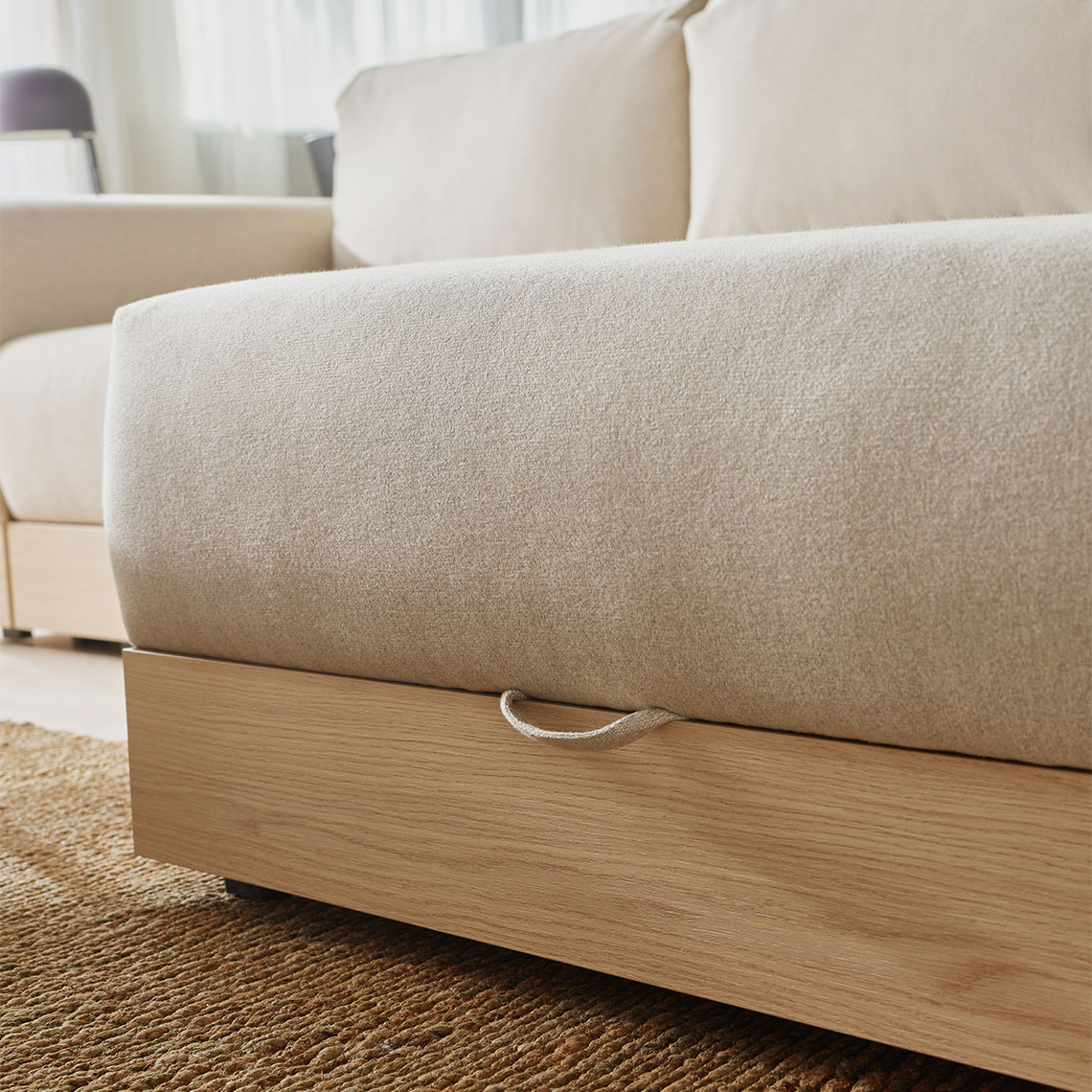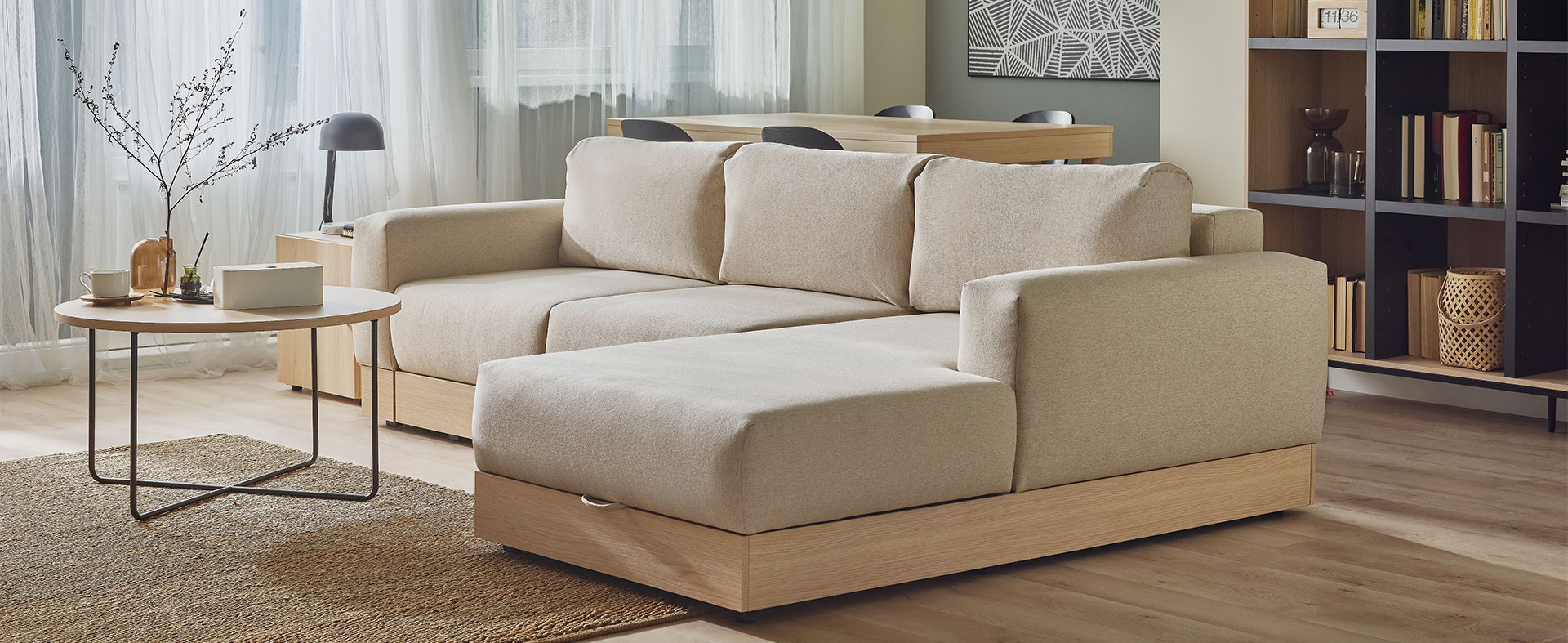 - Le meuble est équipé d'une fonction de couchage DL, adaptée à un usage quotidien. Il se transforme en lit en deux mouvements. Les textiles peuvent être rangés dans 2 compartiments spacieux dissimulés sous l'assise et la chaise longue.