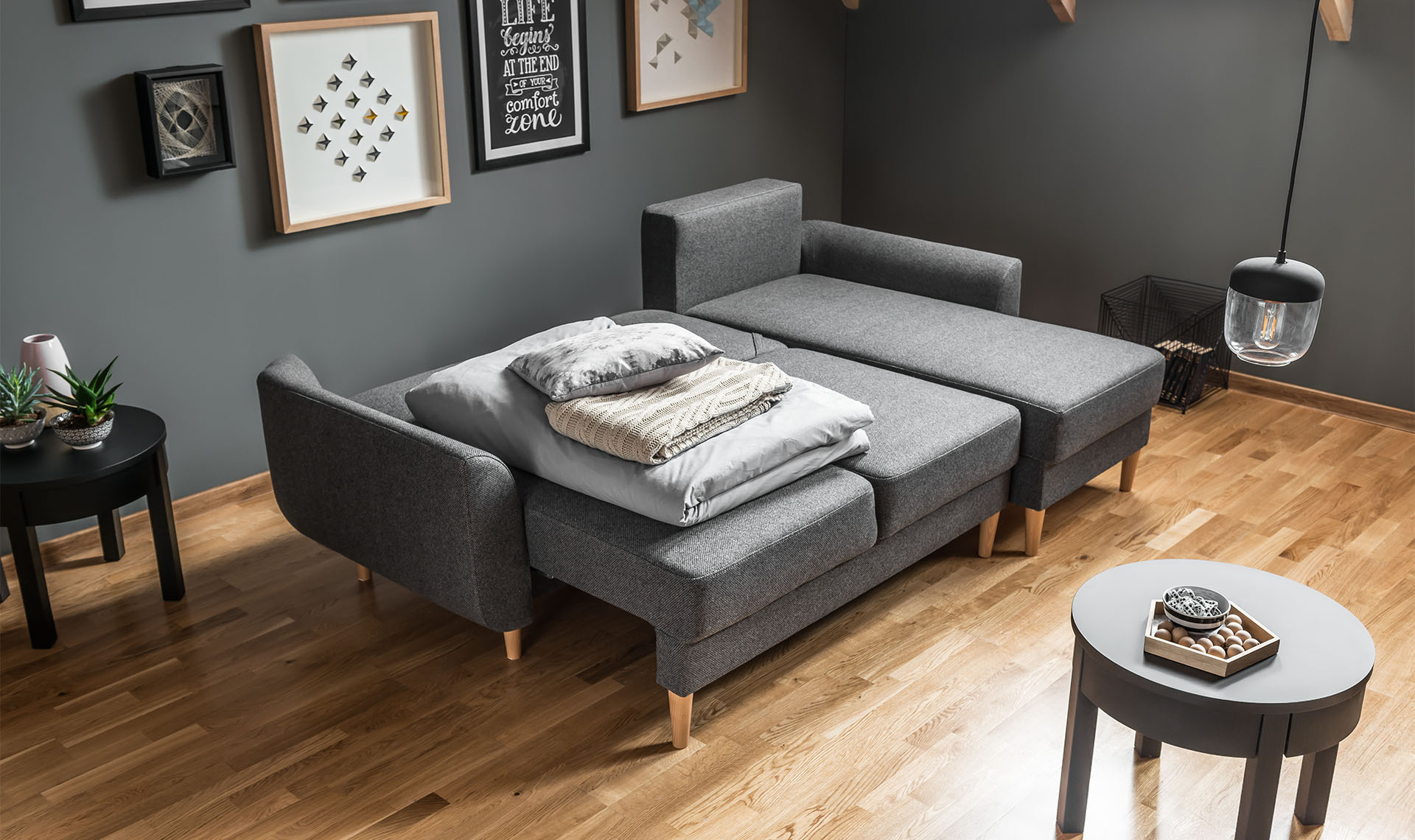 - Le système de dépliage assisté facilite la préparation au sommeil. Pour déplier le canapé d'angle, il suffit de faire glisser l'assise vers l'avant et d'allonger le dossier.