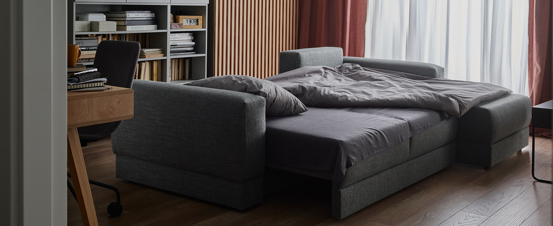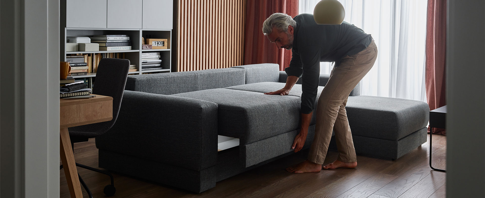 - Le meuble est équipé d'une fonction de couchage DL, adaptée à un usage quotidien. Il se transforme en lit en deux mouvements. Les textiles peuvent être rangés dans 2 compartiments spacieux dissimulés sous l'assise et la chaise longue.