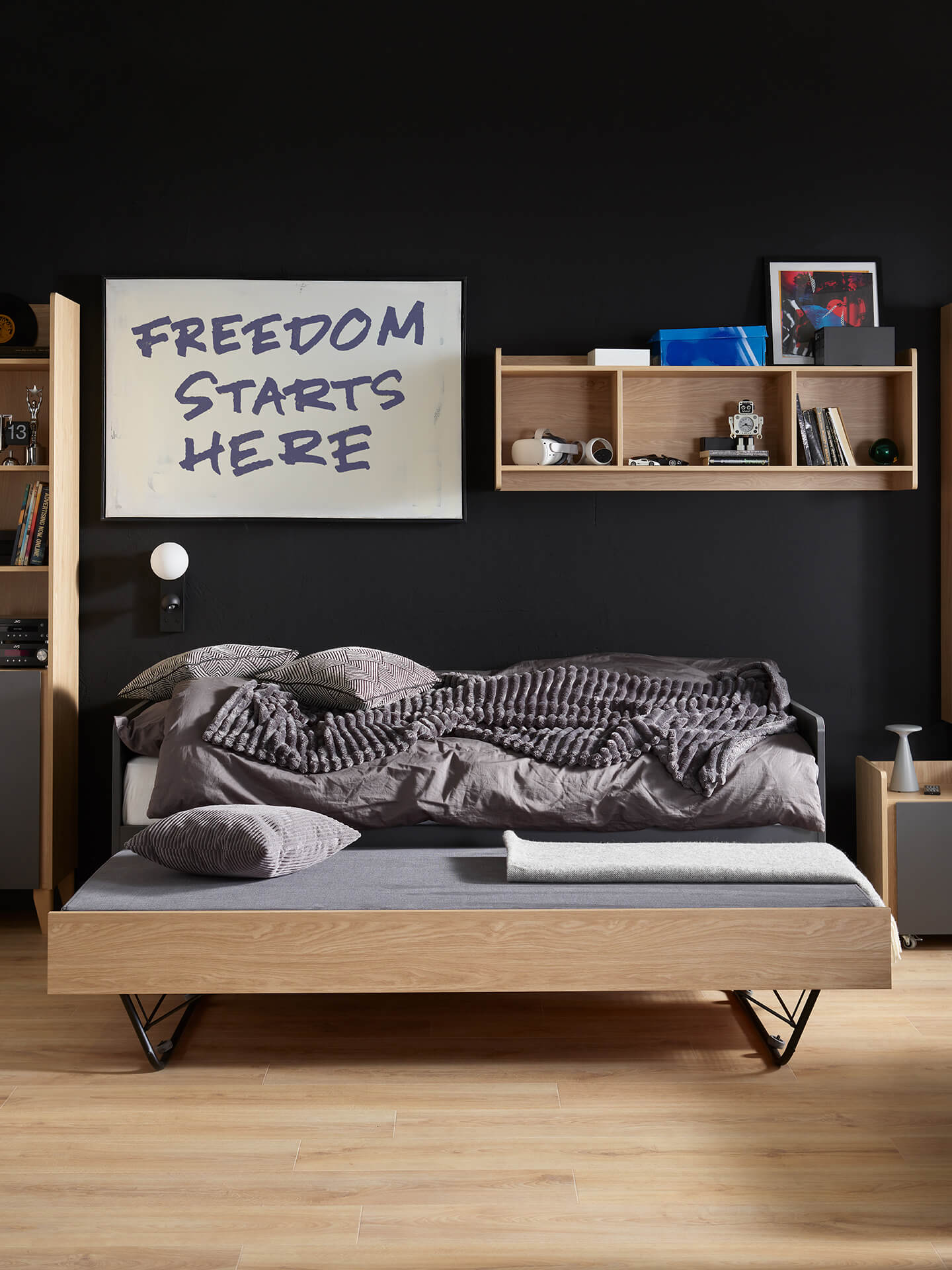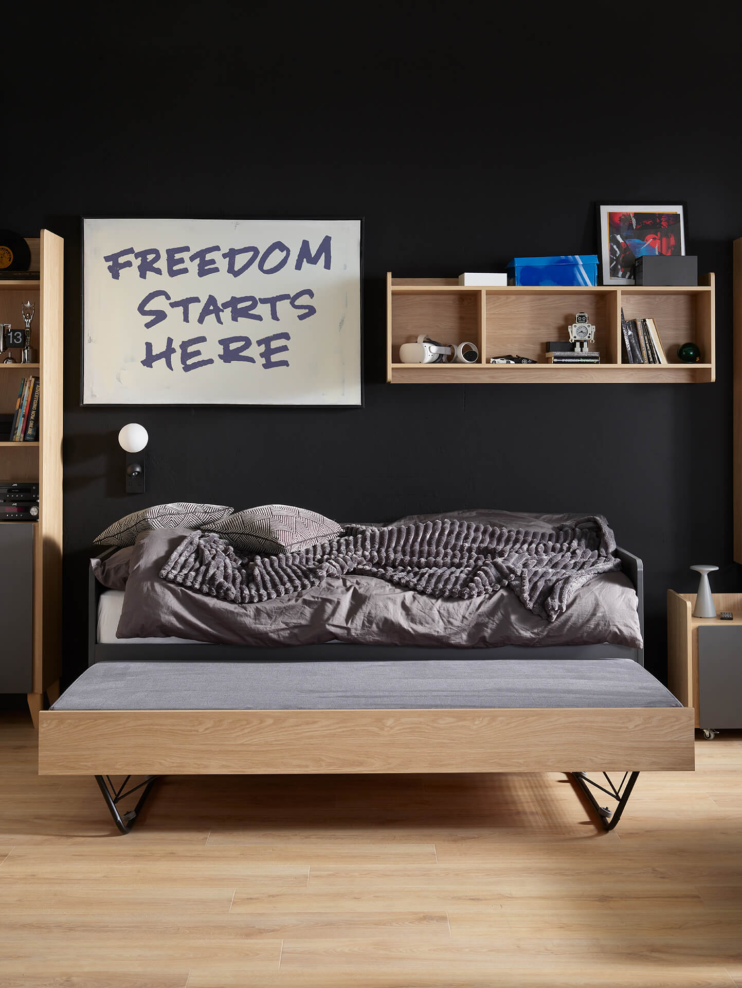 Le canapé Muve est un meuble multitâche qui s'adapte à votre rythme quotidien. Le matin et l'après-midi, il sert de siège confortable et d'espace de jeu, et le soir, il se transforme en lit confortable pour une personne. Il est équipé d'un cadre lit, d'un bac à literie pratique et d'un lit inférieur. Vous pouvez assortir sa couleur à votre intérieur et l'agrémenter d'accessoires utiles - exactement comme vous le souhaitez.
