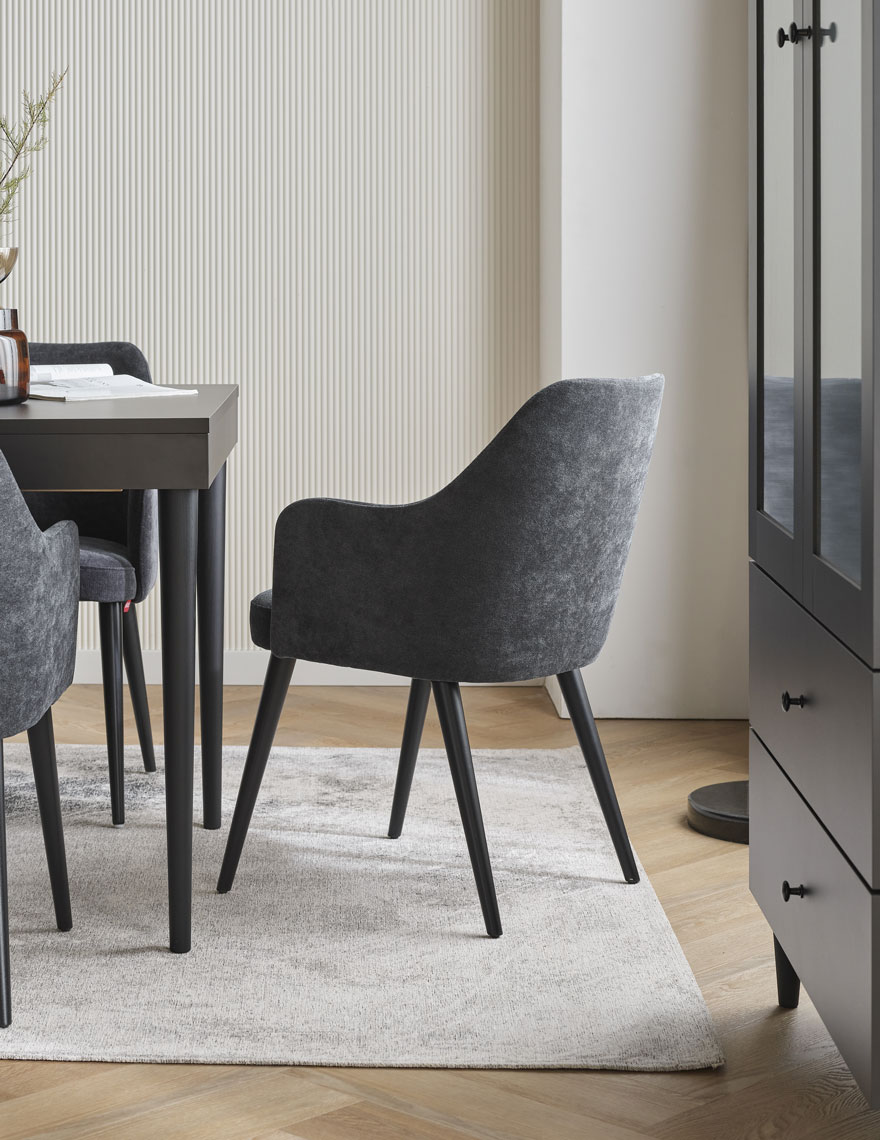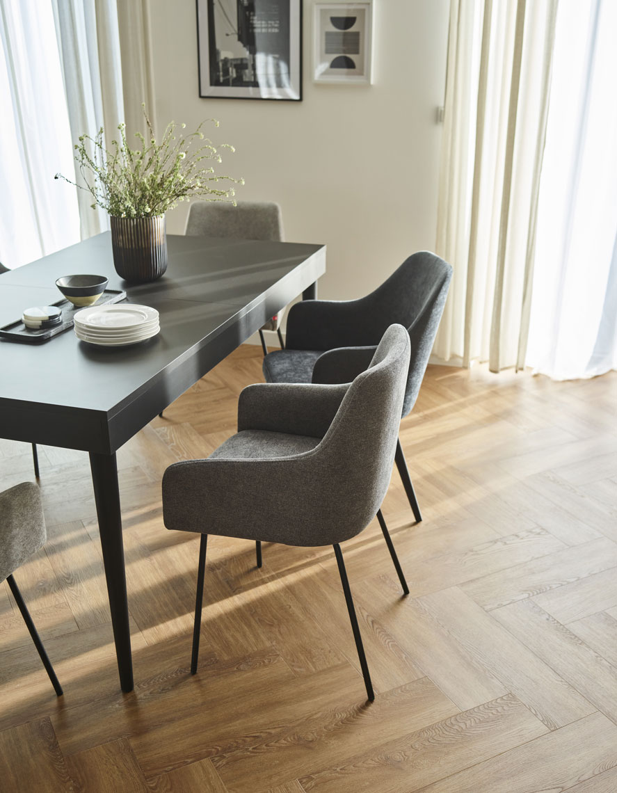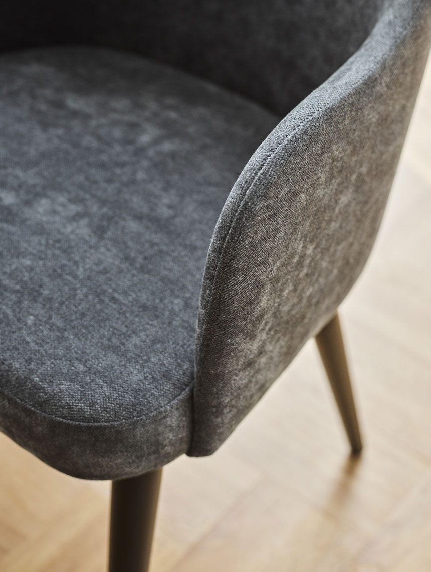- Résistance à l'abrasion : 120 000 cycles Martindale. - La version légère de la chaise est revêtue d'un tissu Solid 30, qui présente un motif mélangé et est lisse et agréable au toucher. Une caractéristique importante de ce tissu est son revêtement hydrophobe (qui empêche l'absorption des liquides renversés).