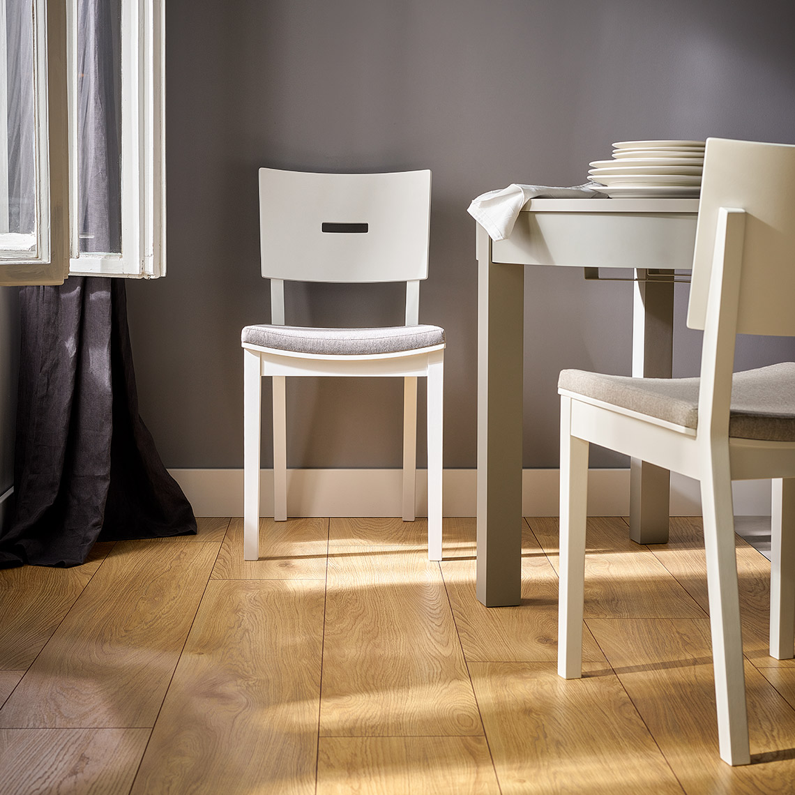 - Dans la version chêne : le dossier de la chaise a une structure qui reproduit le grain naturel du bois. La surface des chaises grises, noires et blanches est recouverte d'une peinture lisse et mate.