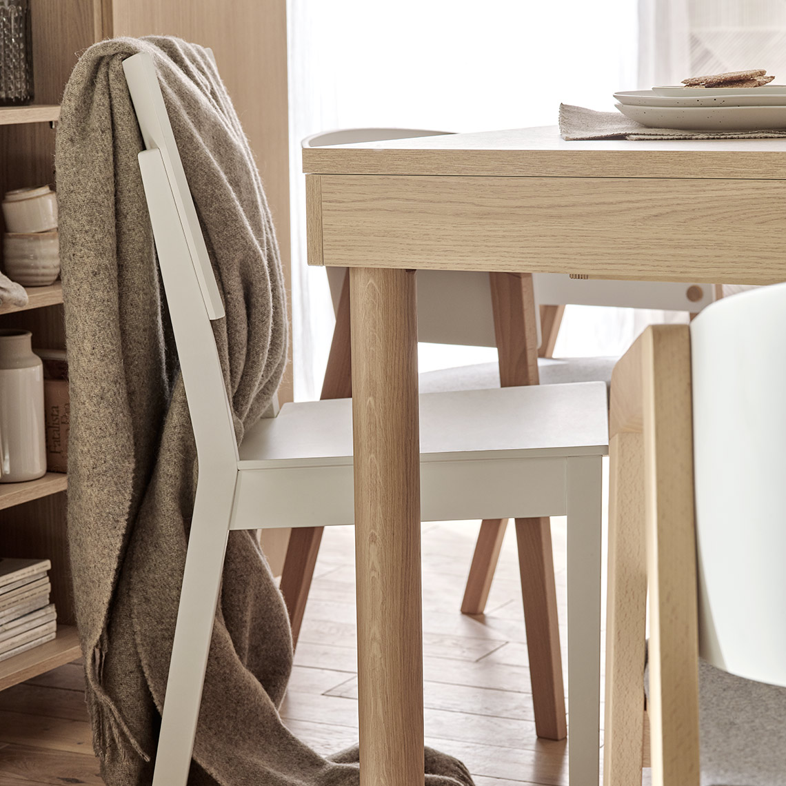 - Dans la version chêne : le dossier et l'assise de la chaise sont structurés de manière à reproduire les veines naturelles du bois. La surface des chaises grises, noires et blanches est recouverte d'une peinture lisse et mate.