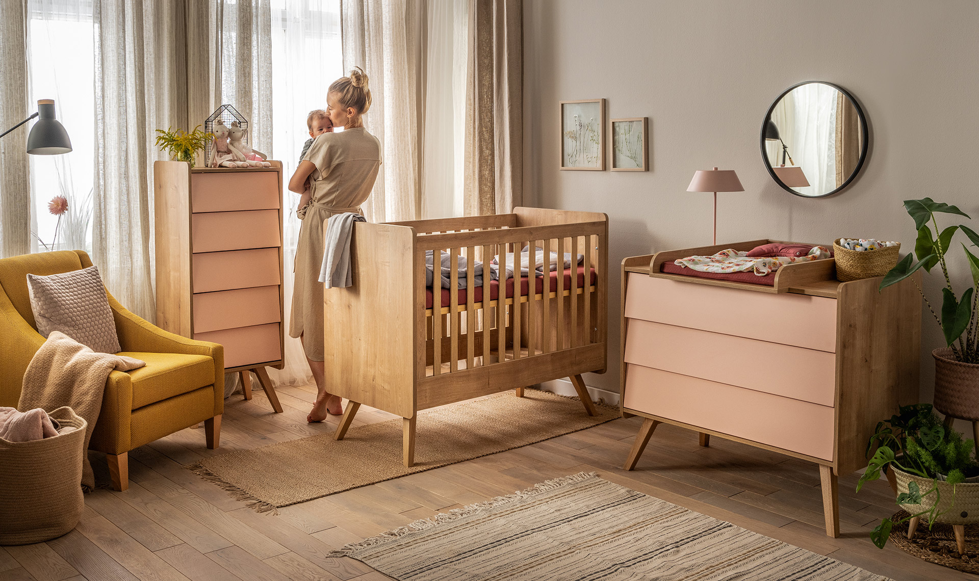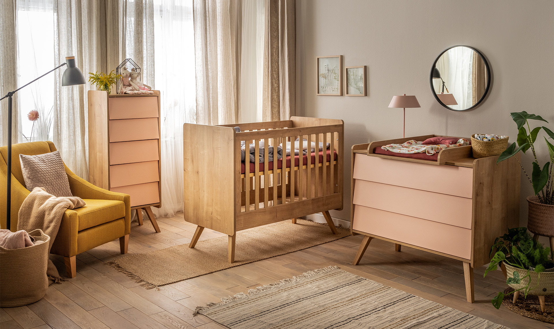- Une commode plus large avec 3 tiroirs aux façades roses est également disponible, permettant d'installer une table à langer sur le dessus.