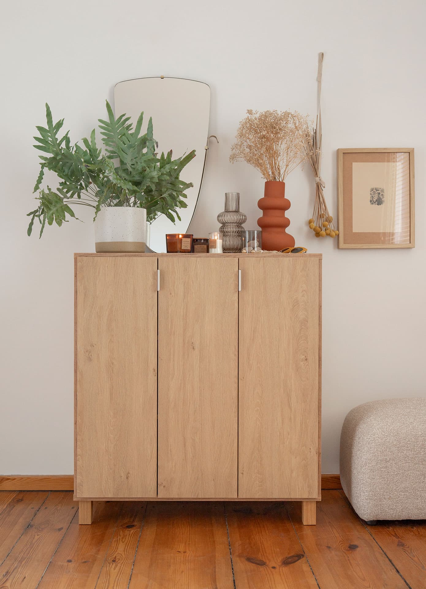 - À l'intérieur de la commode, il y a deux espaces. Un plus large à gauche et un plus étroit à droite. Dans chacun d'eux se trouvent deux étagères réglables en hauteur. Cela vous permet d'adapter l'intérieur de la commode à la taille des objets que vous souhaitez y ranger.
