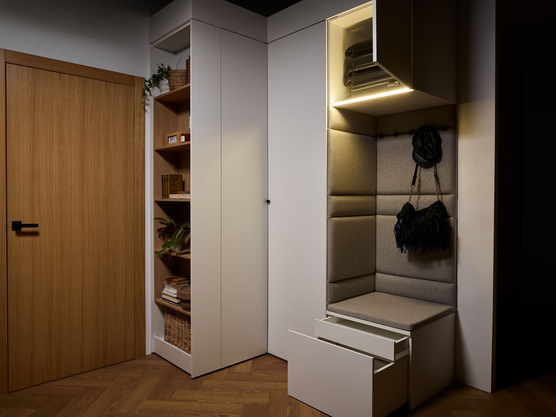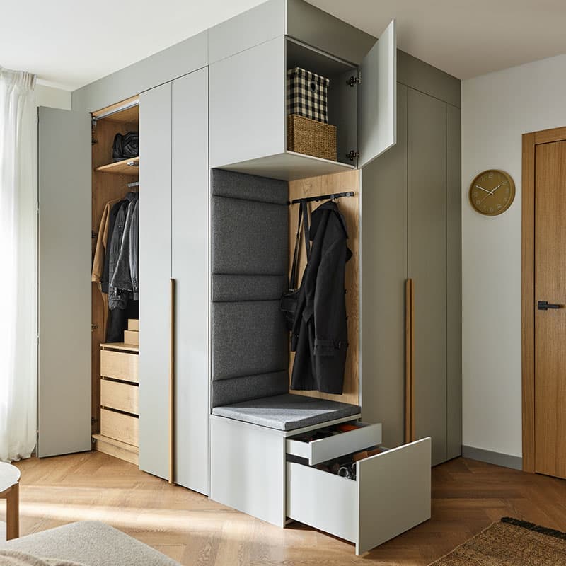 - Ensemble confort - l'équipement comprend un meuble à sièges souples avec un tiroir inférieur pour les chaussures et un tiroir intérieur pour les petits accessoires tels que les parapluies, les clés et les petits accessoires. Il comprend également un panneau arrière en dalle avec un rail à crochets et un pavillon supérieur avec un éclairage LED sur la façade. En outre, la surface arrière de l'encastrement a été finie avec des panneaux rembourrés pour plus de confort et une sensation générale plus agréable.