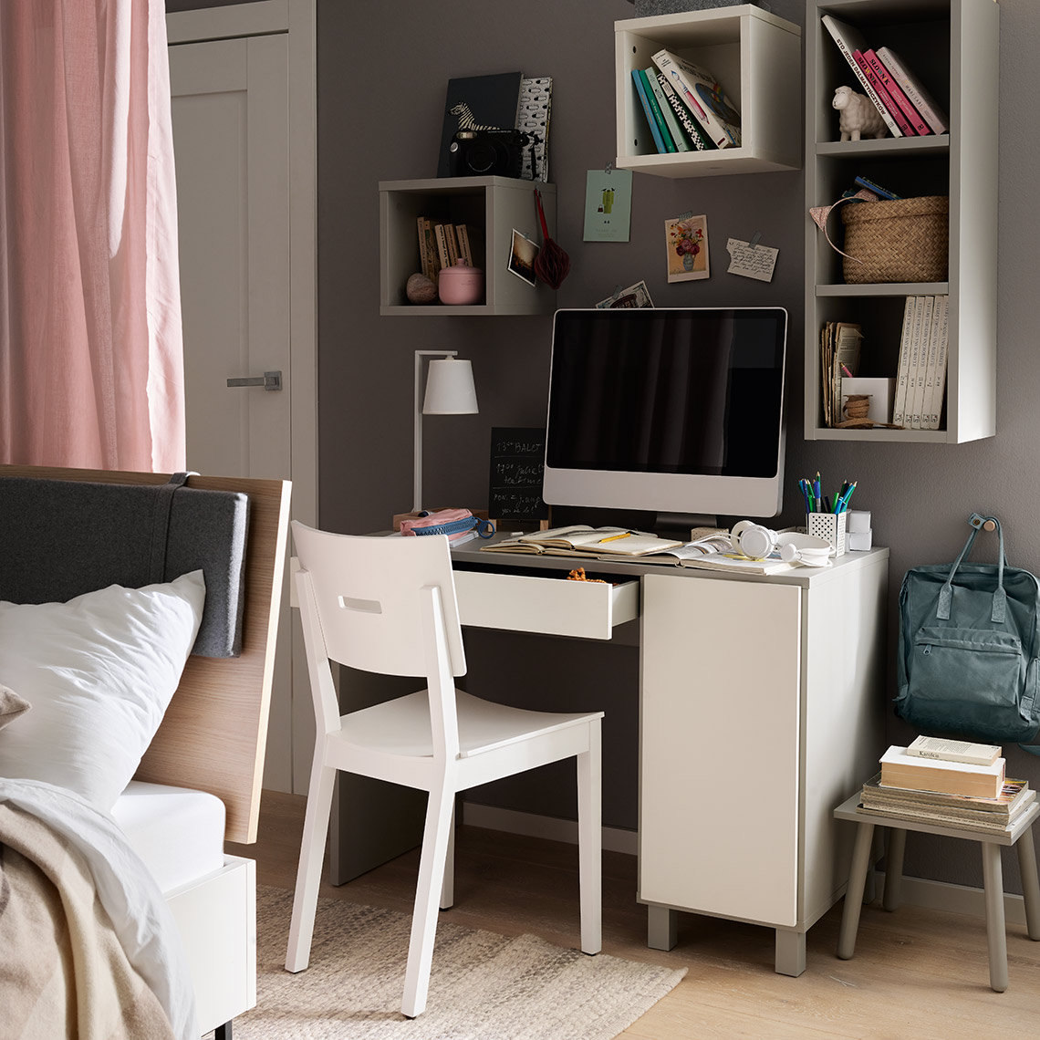 L'étagère est disponible en 4 couleurs : blanc, gris, noir et chêne. Vous pouvez la fixer au mur individuellement ou la multiplier en plusieurs couleurs pour créer un arrangement intéressant sur le mur. L'étagère peut également être posée sur le sol et faire office de petite table.