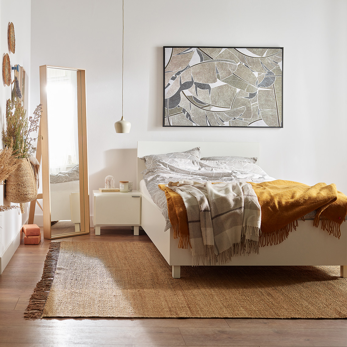- Panneaux d'extrémité de lit : panneaux d'ameublement stratifiés ou peints, selon l'option de couleur choisie. Les panneaux stratifiés sont disponibles en blanc, gris et chêne. Le tiroir peint est disponible en noir.