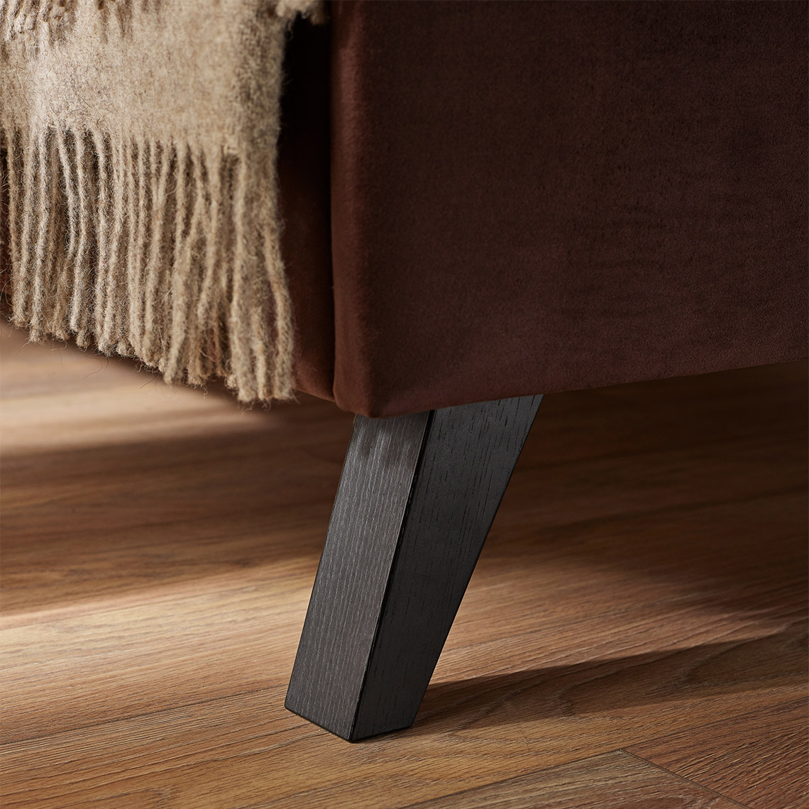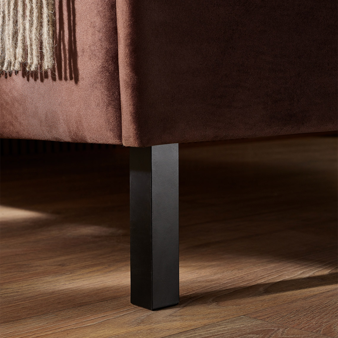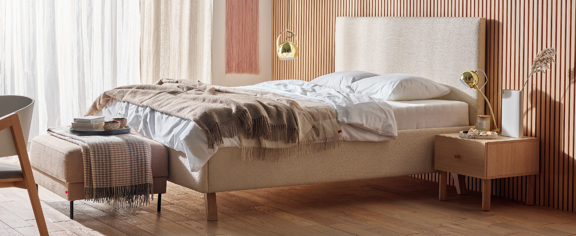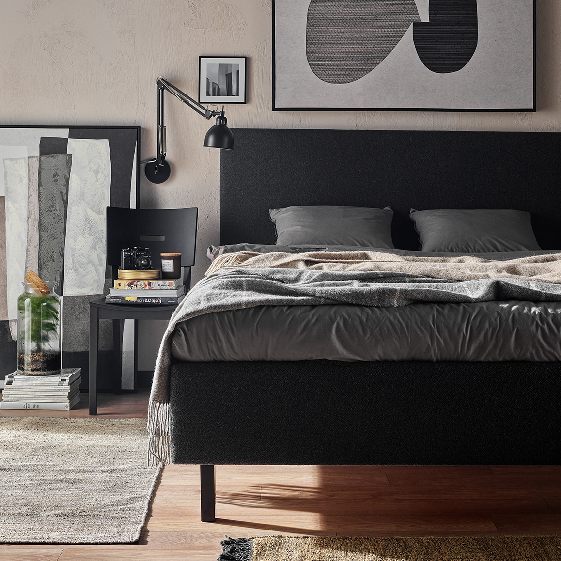 - Les pieds en bois du lit peuvent également être personnalisés. D'une hauteur de 18 cm, ils facilitent le nettoyage de la chambre. Ils sont disponibles en 5 versions : chêne incliné, chêne clair incliné et noir incliné, chêne clair cylindrique et noir droit.