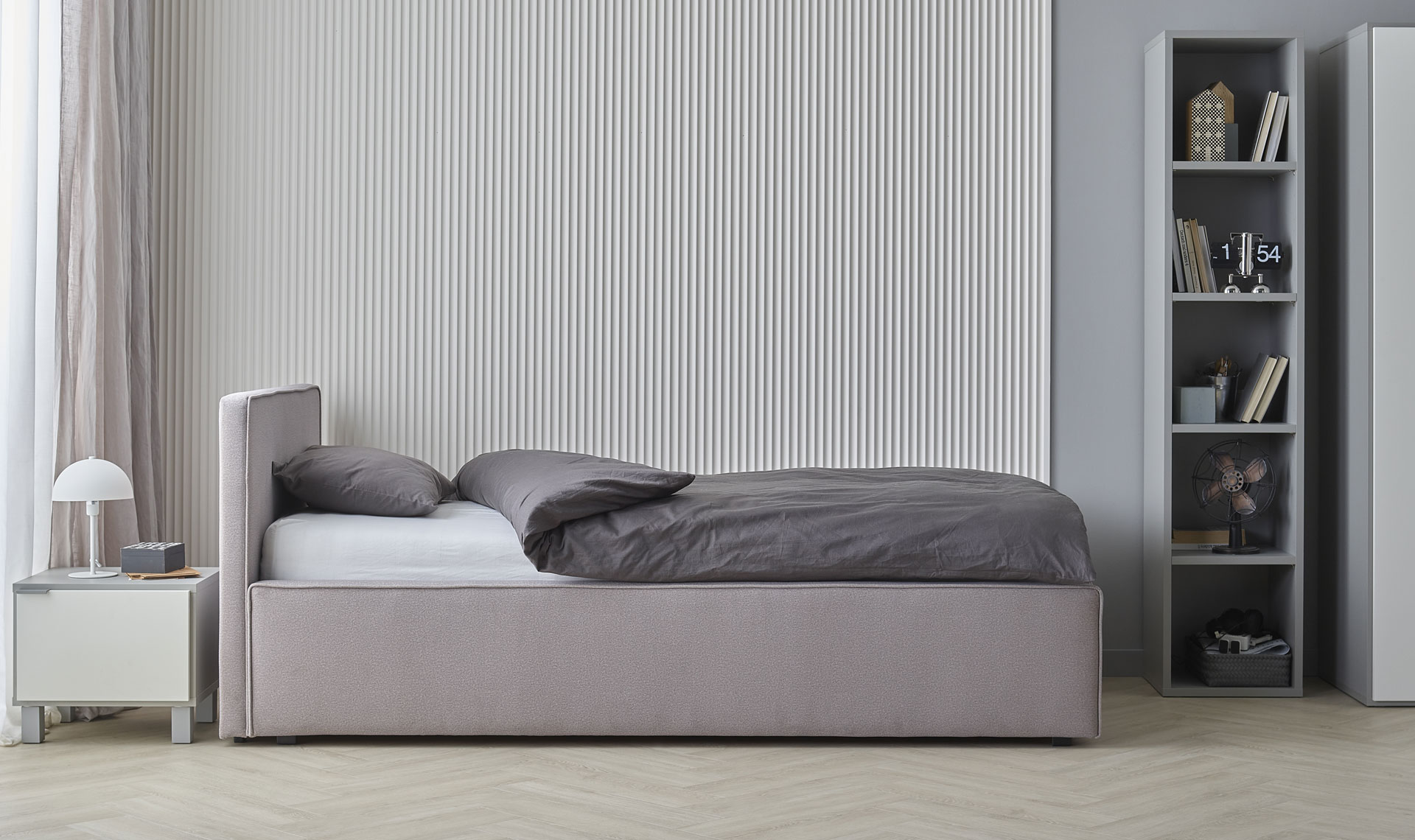 Le lit rembourré Nook est le meuble idéal pour la chambre d'un enfant ou d'un adolescent. Il sera le compagnon idéal pour jouer avec ses amis, lire des livres au coucher et se détendre le matin. L'appui-tête moelleux offre un soutien confortable pendant que vous vous reposez. Vous pouvez choisir vous-même la couleur et le type de tissu pour l'assortir parfaitement à votre intérieur.