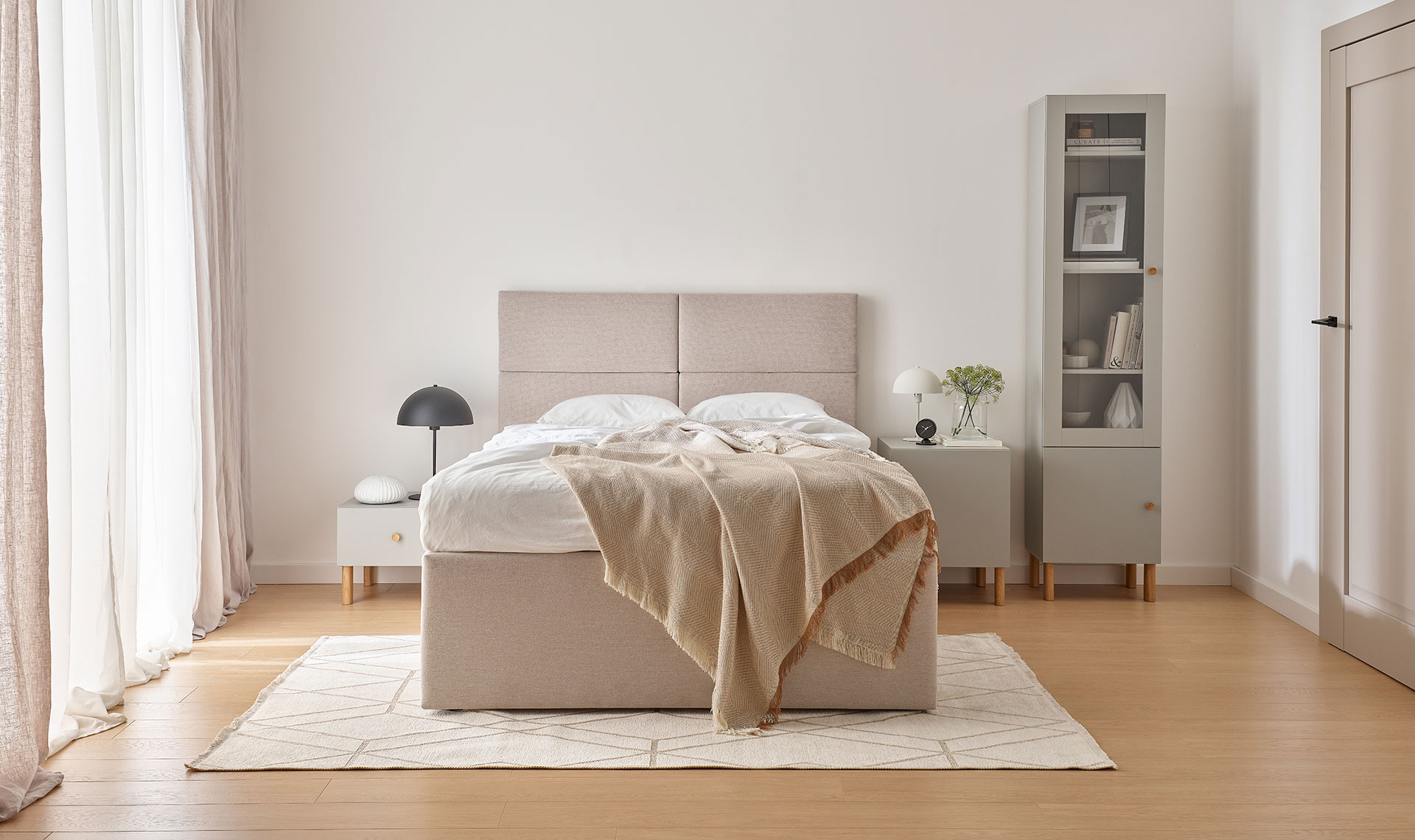 - La finition du lit peut être personnalisée en choisissant le tissu d'ameublement et les pieds. Des tissus résistants aux taches et aux animaux sont disponibles dans la gamme VOX. Un carnet de modèles complet est disponible dans la salle d'exposition VOX.