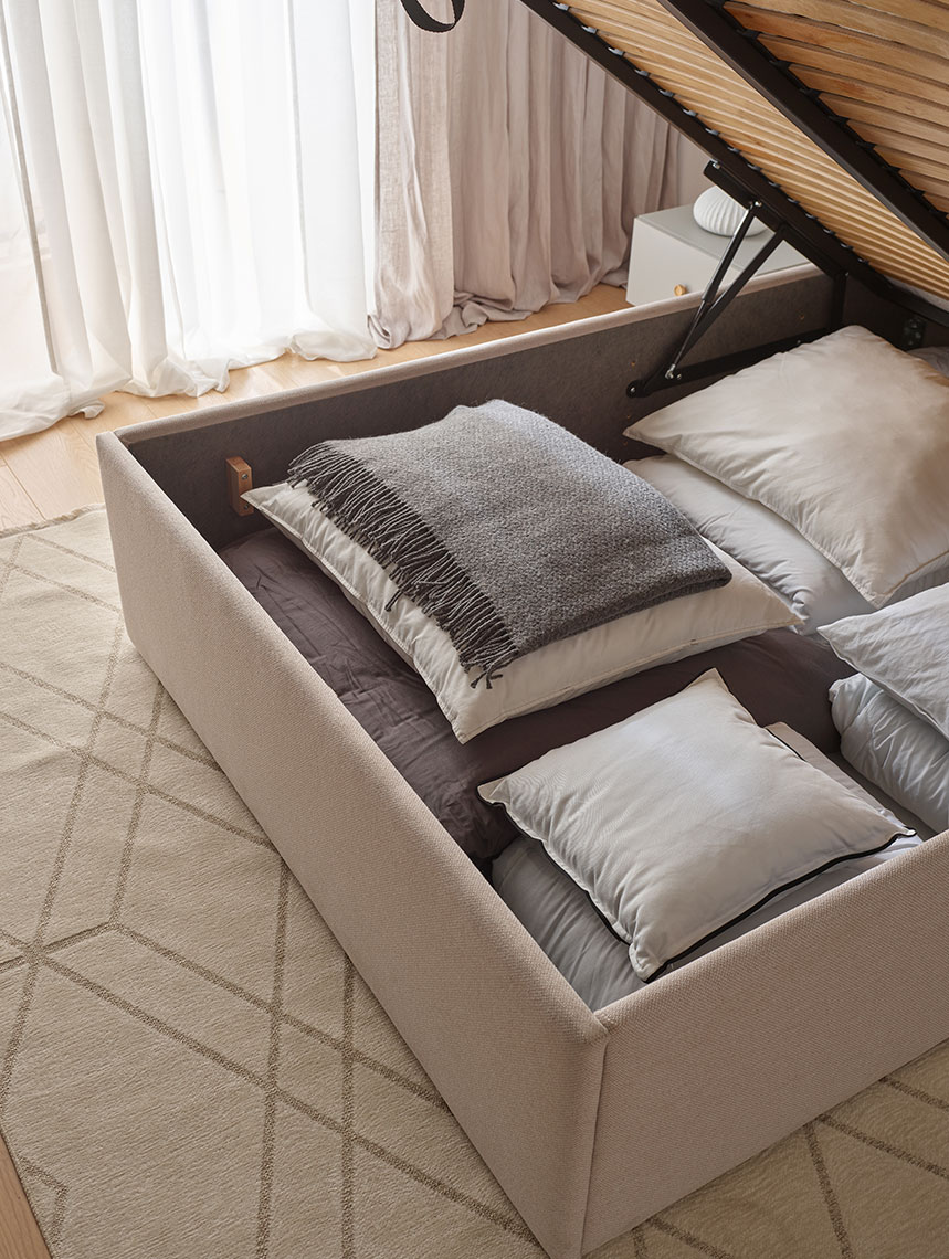 - Sous le matelas se trouve un grand coffre, idéal pour ranger la literie, les vêtements et autres textiles. Le mécanisme de basculement du cadre permet d'accéder facilement à l'intérieur. Dimensions du conteneur : 140 x 200x max 31 cm.
