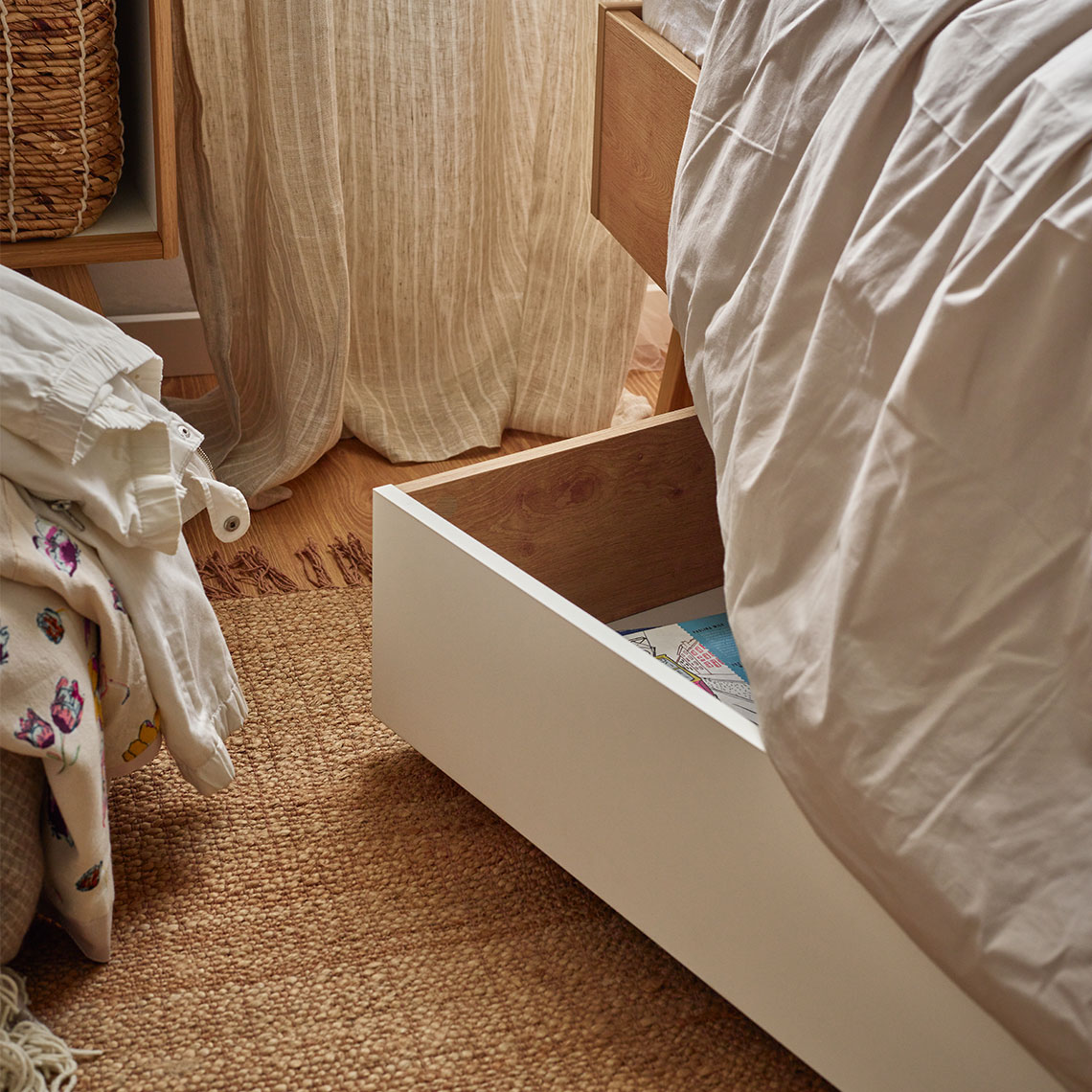 - La couleur chêne est apportée par le placage avec un motif bois sur le cadre et le dessus du lit.