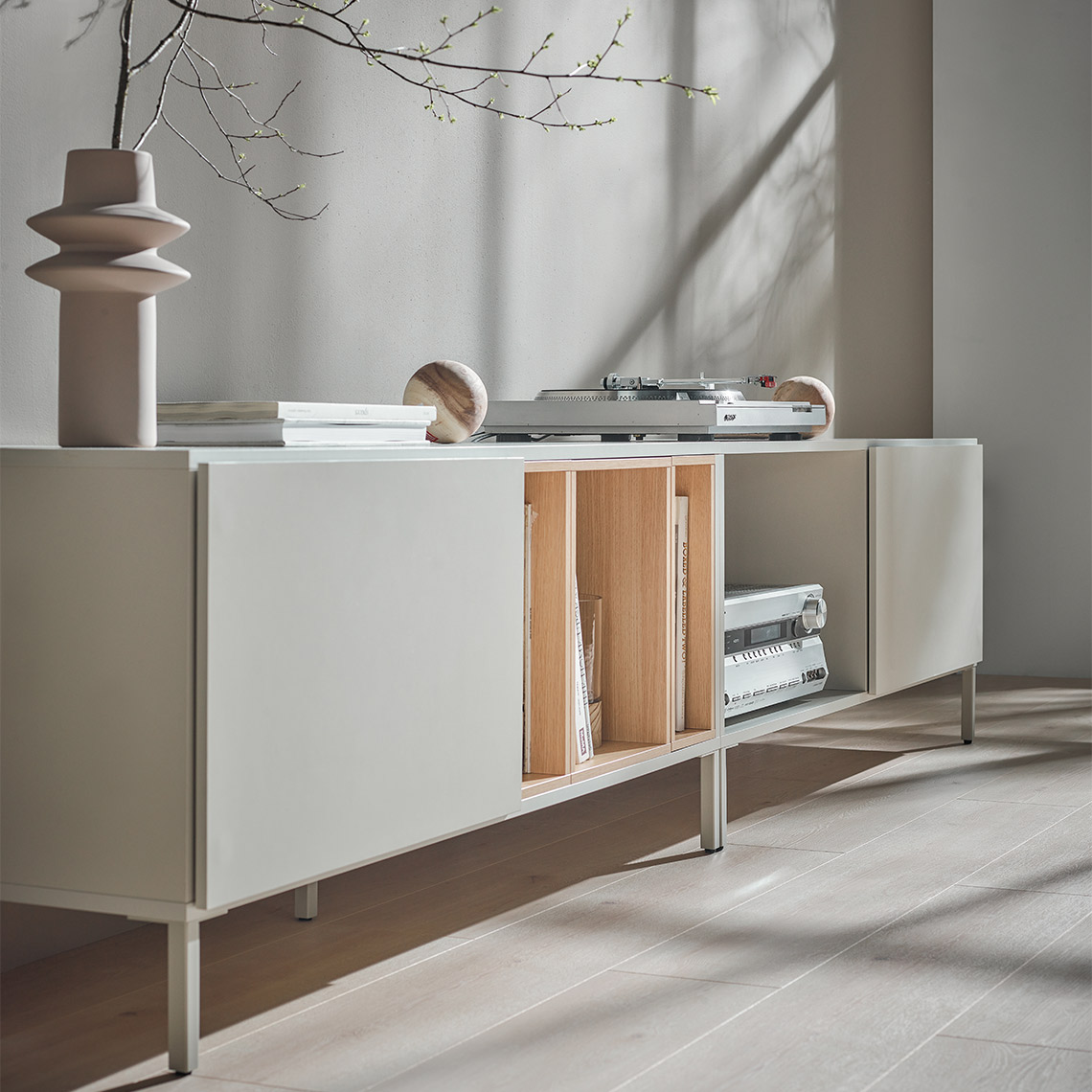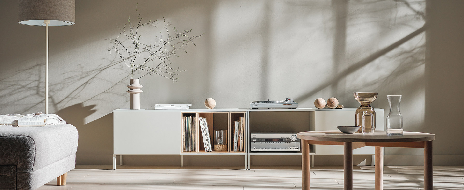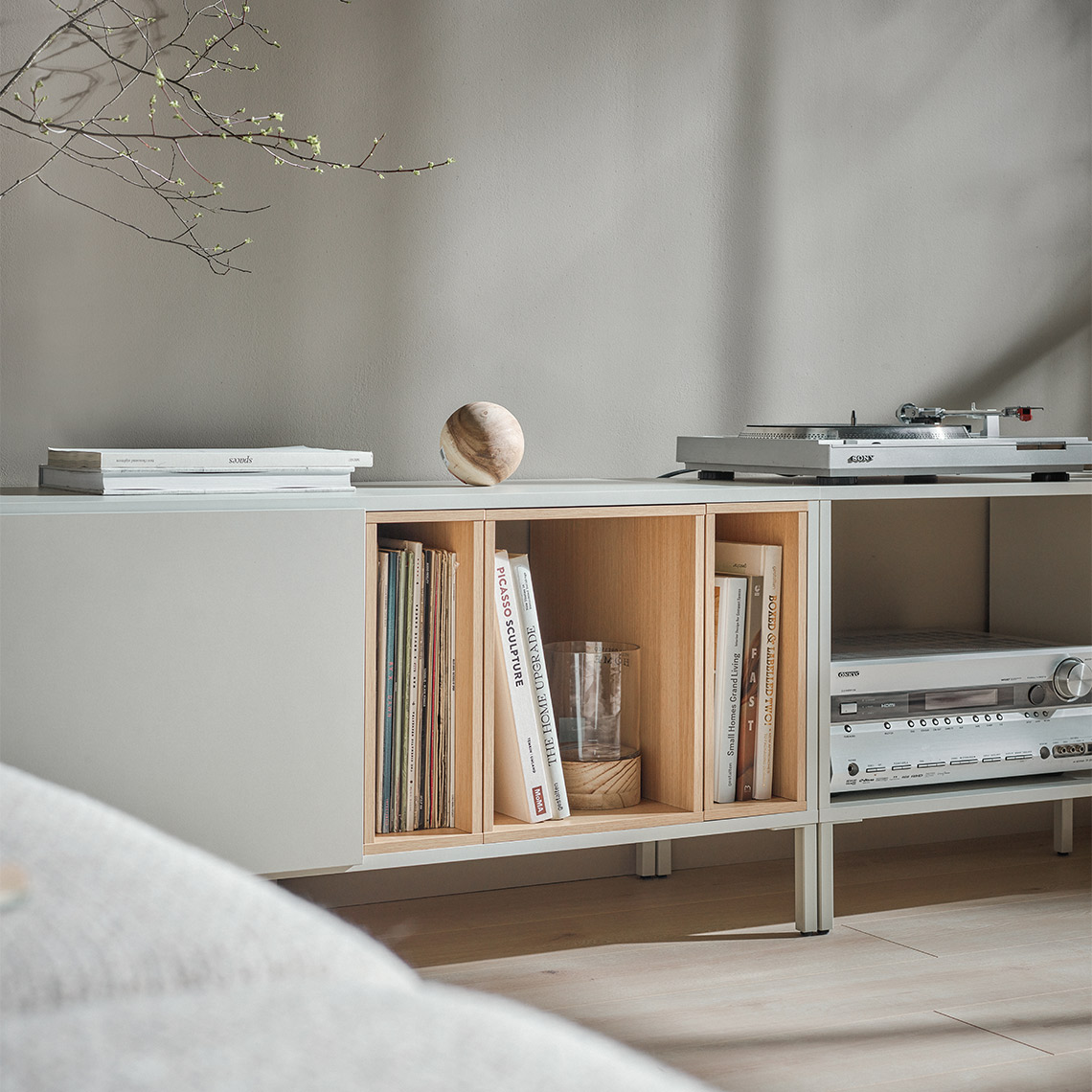 Le système Into vous permet de composer librement des bibliothèques, des commodes et des armoires en fonction de vos propres besoins et des différents espaces. Le système intuitif comprend un meuble, un jeu de pieds et des boîtes (grandes et petites) conçues pour organiser les espaces ouverts du meuble. Vous pouvez choisir une configuration prête à l'emploi ou concevoir votre propre meuble en combinant les différents éléments.
