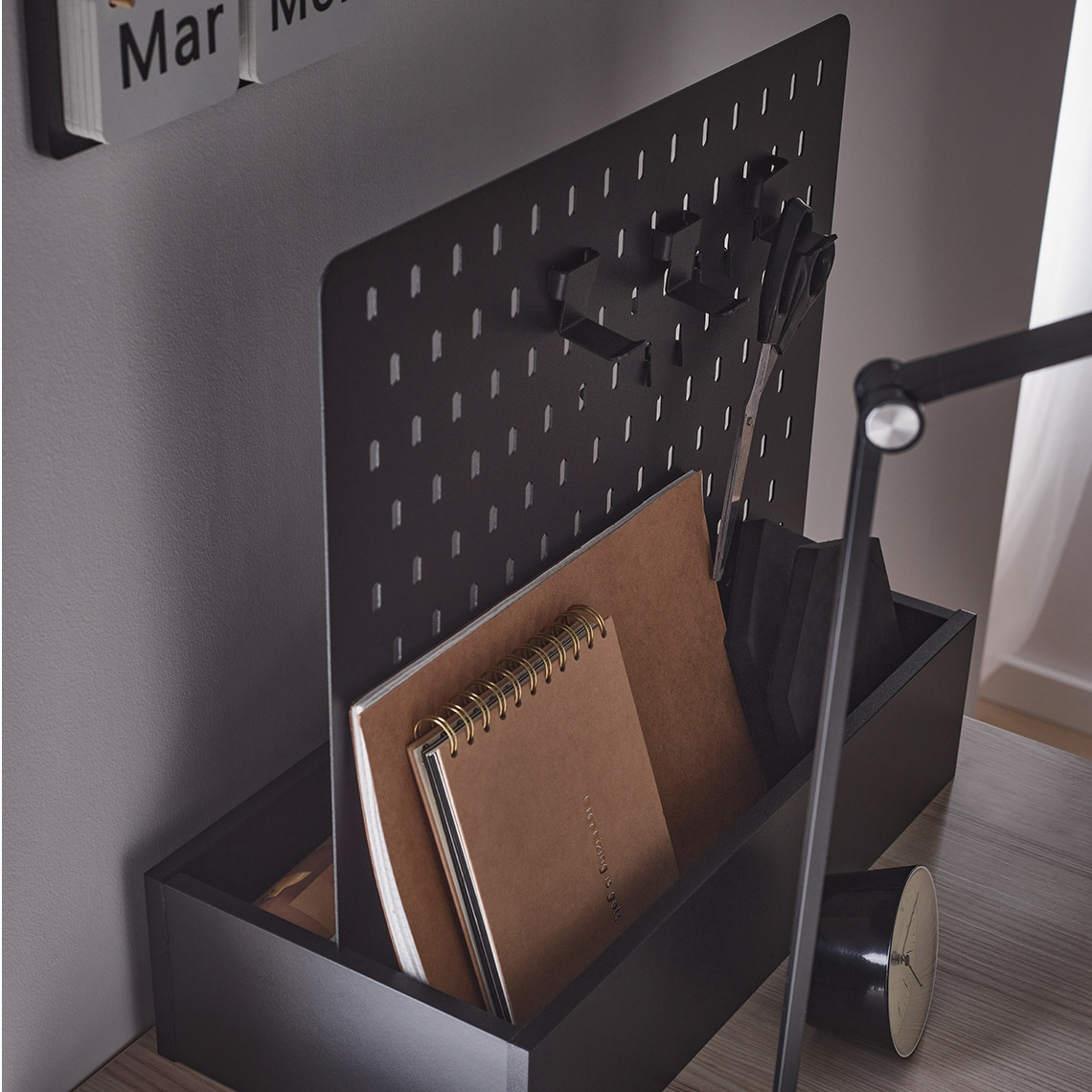 - Le panneau perforé et les crochets ont été fabriqués à partir d'une tôle d'acier thermolaquée à la texture fine et mate.