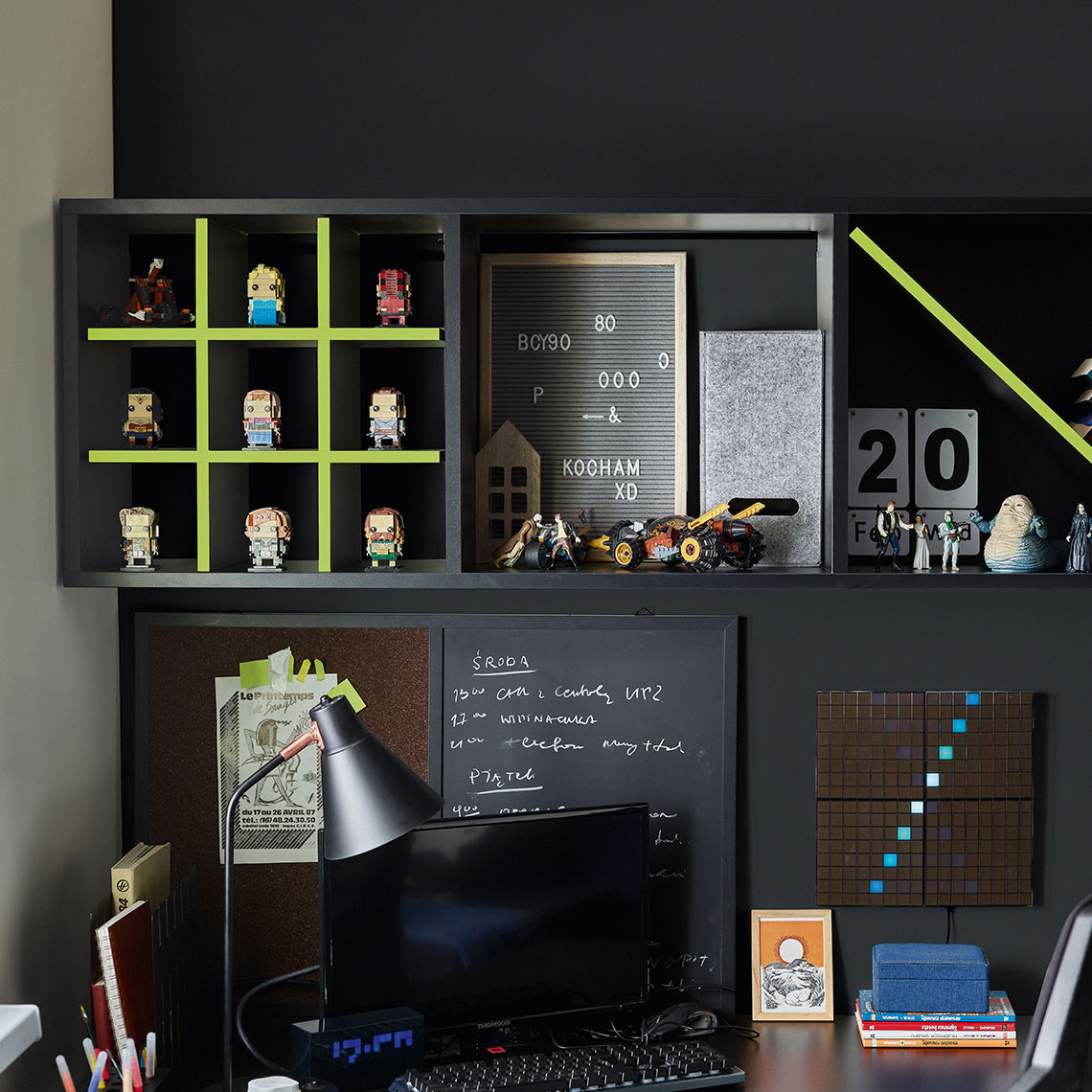 - La grille minimaliste ajoute de la variété à l'aspect de l'étagère et attire l'attention. C'est un bon moyen d'exposer des souvenirs de vacances et d'autres bibelots ayant une valeur sentimentale.